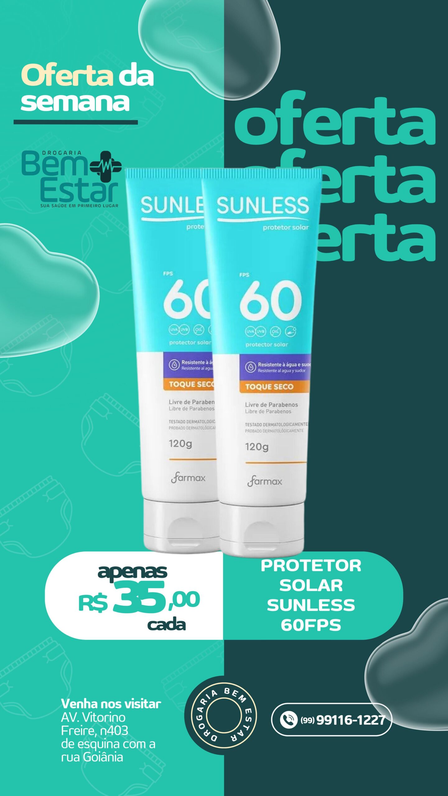 Protetor Solar Sunless FPS 60 (120g) – Toque seco, resistente à água e livre de parabenos. Proteção e conforto para sua pele por apenas R$ 35,00 cada.