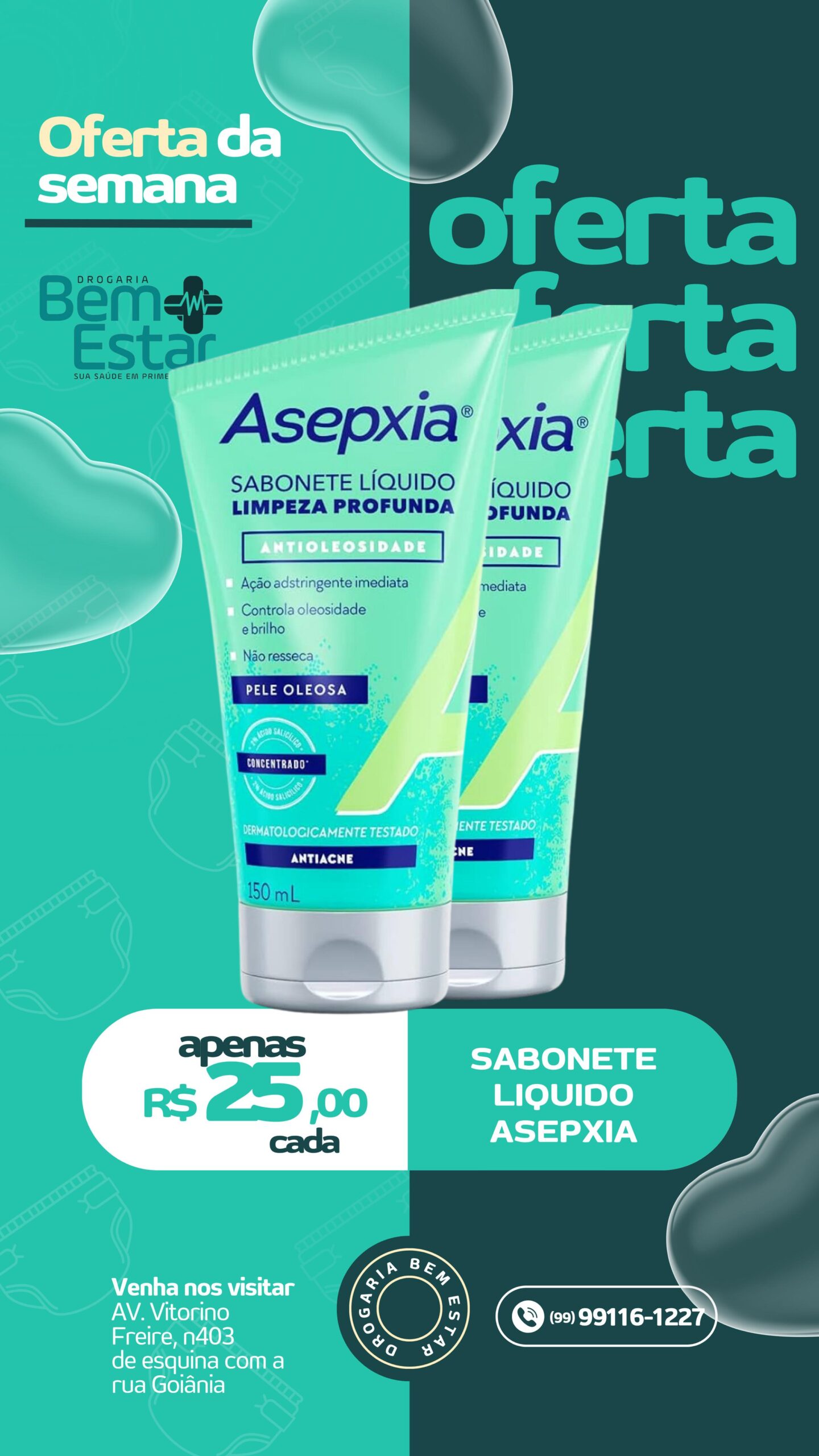 Sabonete Líquido Asepxia (150ml) – Limpeza profunda e controle da oleosidade sem ressecar a pele. Apenas R$ 25,00 cada.