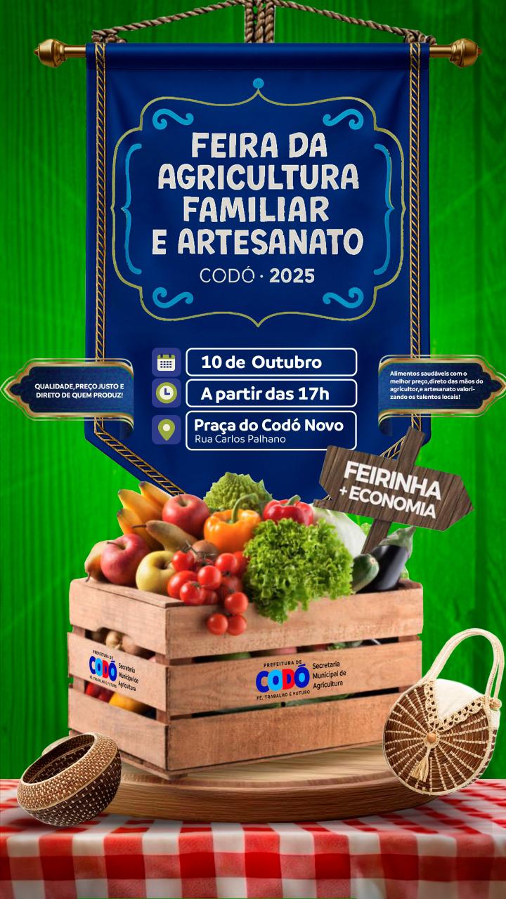 A Prefeitura Municipal de Codó, por meio da Secretaria Municipal de Agricultura, Pecuária e Abastecimento (SECMAPA) e da Secretaria Municipal de Cultura e Turismo, realizará nesta sexta-feira (10) a 5ª edição da Feira da Agricultura Familiar e Artesanato. O evento acontecerá a partir das 17h, na Praça do Codó Novo, Rua Carlos Palhano, reunindo agricultores, artesãos e a comunidade em um ambiente de cultura, tradição e oportunidades.