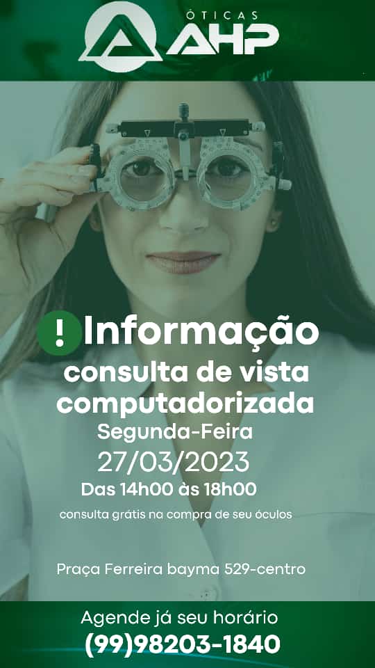 As Óticas HP realizará consulta de vista computadorizada na segunda-feira, dia 27 de março. Aproveite e agende o seu horário e garanta sua consulta grátis, das 14:00h às 18:00h. Óticas AHP – Praça Ferreira Bayma 529A Centro, Codó-MA. Telefone (99) 98203-1840.