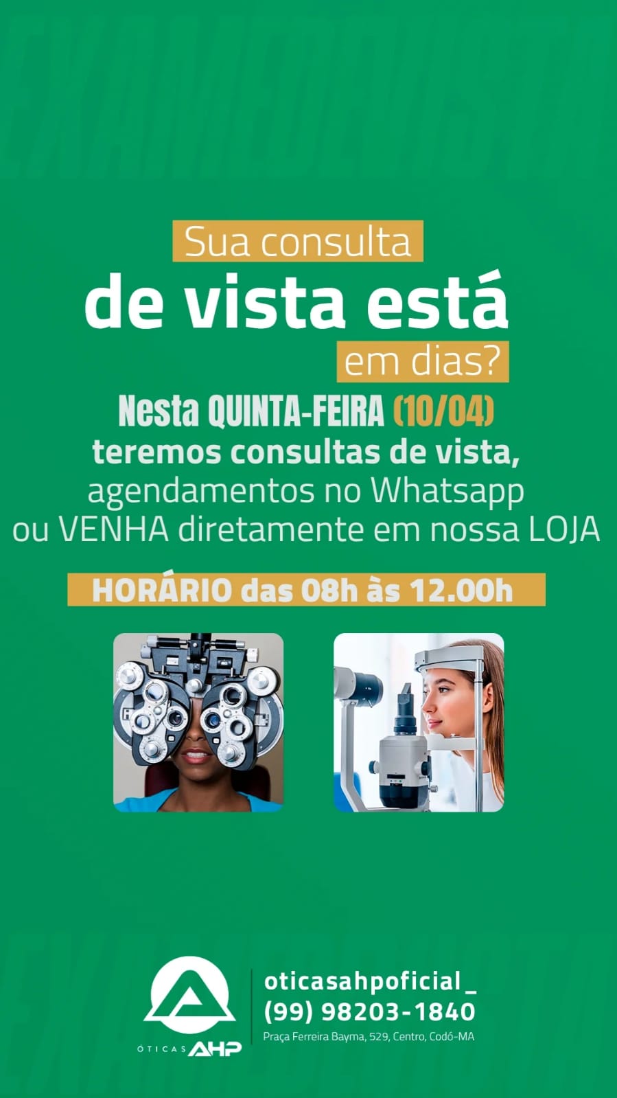Atenção!! As Óticas HP agora realizará exames de vista computadorizado nas segundas e quintas-feiras. Dia 10 de abril haverá consulta. Aproveite, agende o seu horário e garanta sua consulta grátis (na compra dos óculos), das 14h às 18h. Óticas AHP – Praça Ferreira Bayma 529A Centro, Codó-MA. Telefone (99) 98203-1840.