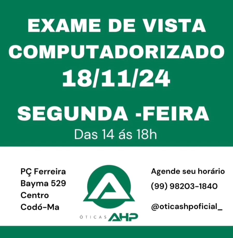 Atenção!! As Óticas HP agora realizará exames de vista computadorizado nas segundas e quintas-feiras. Dia 18 de novembro haverá consulta. Aproveite, agende o seu horário e garanta sua consulta grátis (na compra dos óculos), das 14h às 18h. Óticas AHP – Praça Ferreira Bayma 529A Centro, Codó-MA. Telefone (99) 98203-1840.