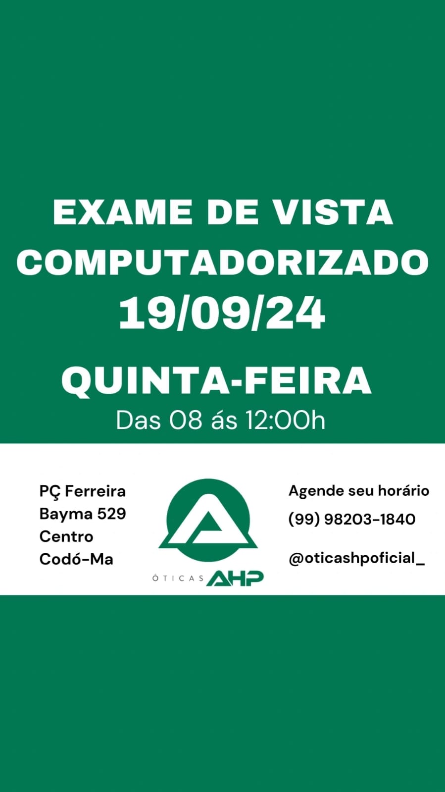 Atenção!! As Óticas HP agora realizará exames de vista computadorizado nas segundas e quintas-feiras. Dia 19 de setembro haverá consulta. Aproveite, agende o seu horário e garanta sua consulta grátis (na compra dos óculos), das 14h às 18h. Óticas AHP – Praça Ferreira Bayma 529A Centro, Codó-MA. Telefone (99) 98203-1840.