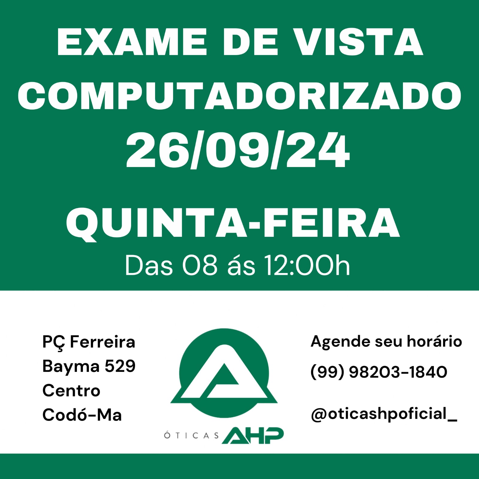 Atenção!! As Óticas HP agora realizará exames de vista computadorizado nas segundas e quintas-feiras. Dia 26 de setembro haverá consulta. Aproveite, agende o seu horário e garanta sua consulta grátis (na compra dos óculos), das 14h às 18h. Óticas AHP – Praça Ferreira Bayma 529A Centro, Codó-MA. Telefone (99) 98203-1840.