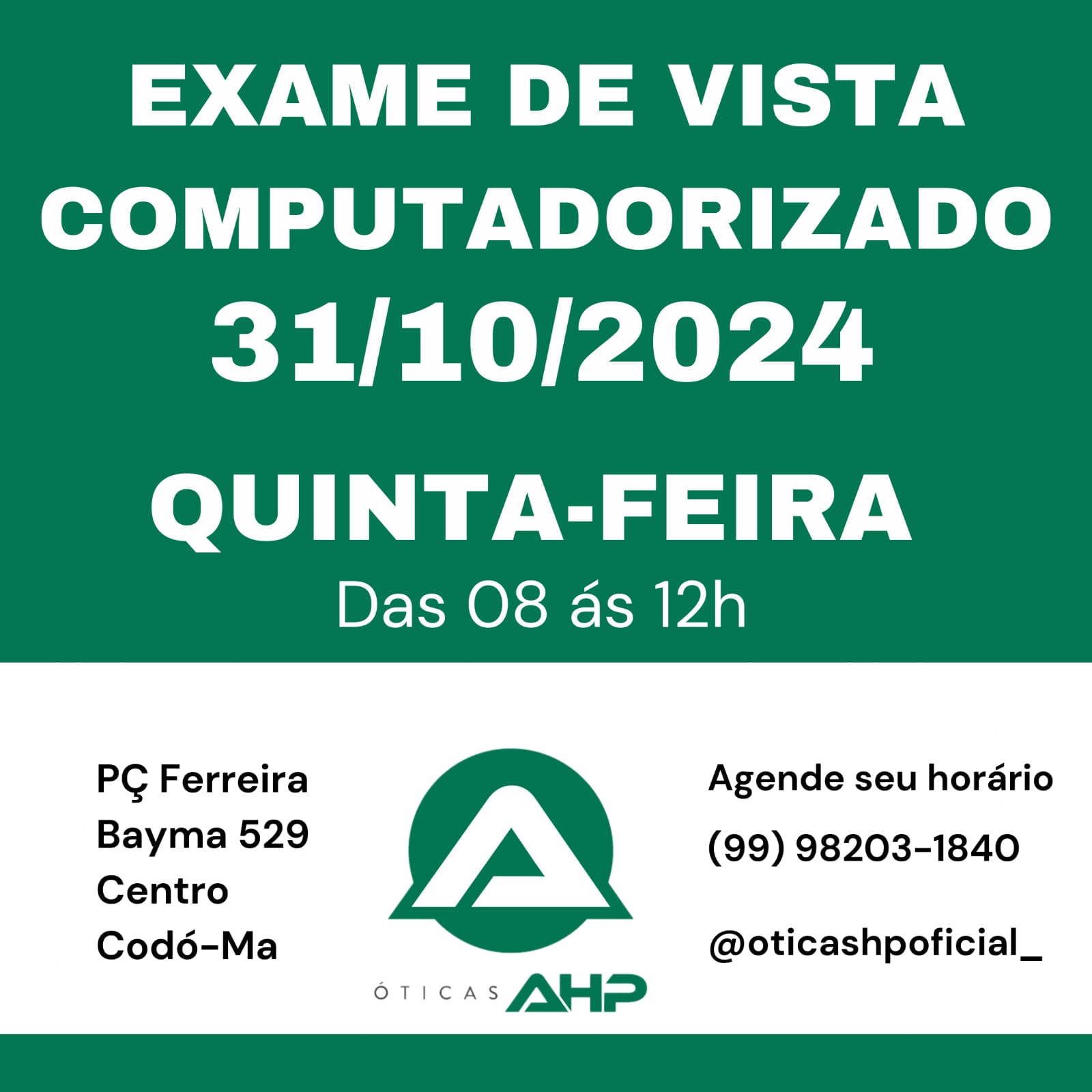 Atenção!! As Óticas HP agora realizará exames de vista computadorizado nas segundas e quintas-feiras. Dia 31 de outubro haverá consulta. Aproveite, agende o seu horário e garanta sua consulta grátis (na compra dos óculos), das 14h às 18h. Óticas AHP – Praça Ferreira Bayma 529A Centro, Codó-MA. Telefone (99) 98203-1840.