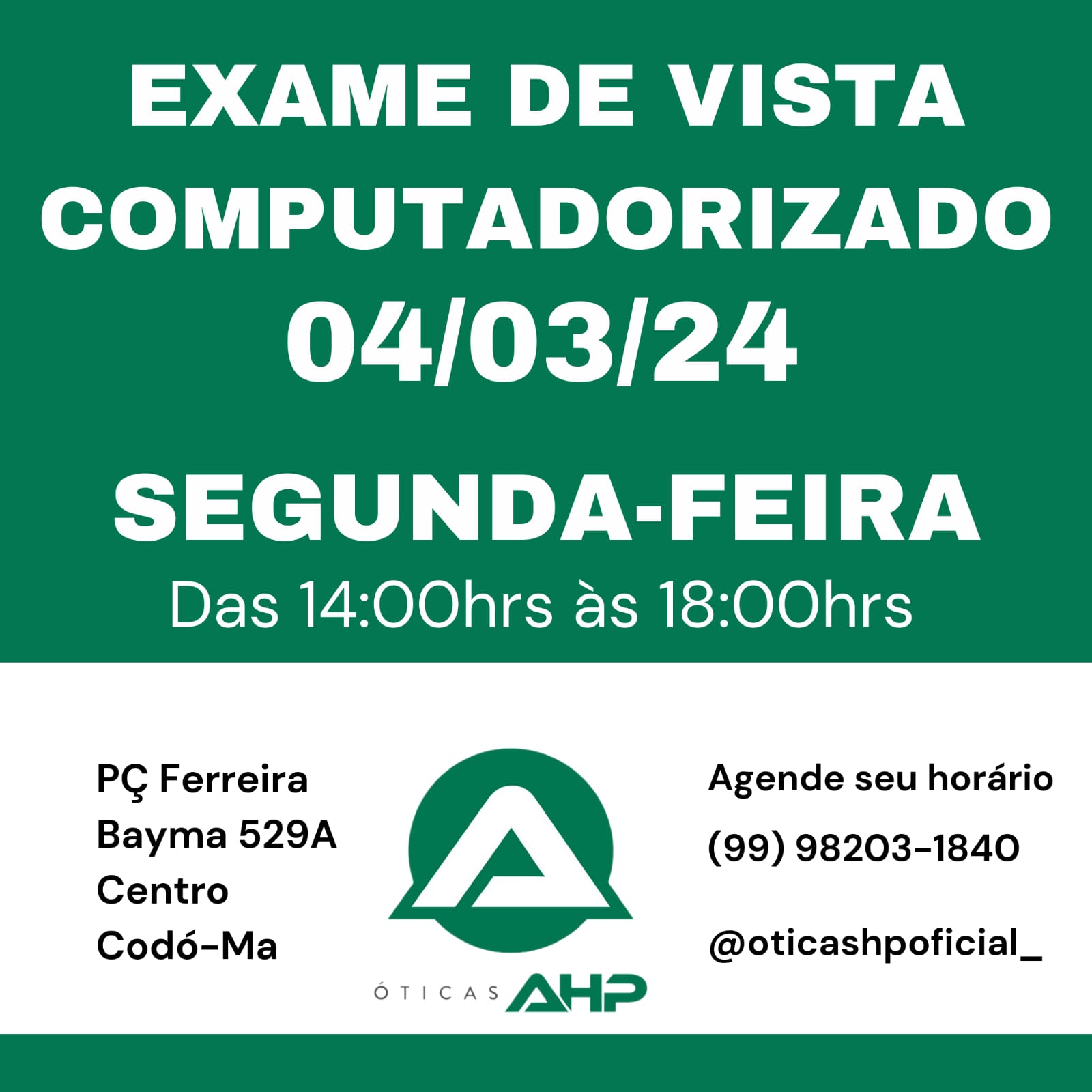 Atenção! As Óticas HP realizará exames de vista computadorizado na segunda-feira, dia 04 de março. Aproveite e agende o seu horário e garanta sua consulta grátis (na compra dos óculos), das 14:00h às 18:00h. Óticas AHP – Praça Ferreira Bayma 529A Centro, Codó-MA. Telefone (99) 98203-1840.