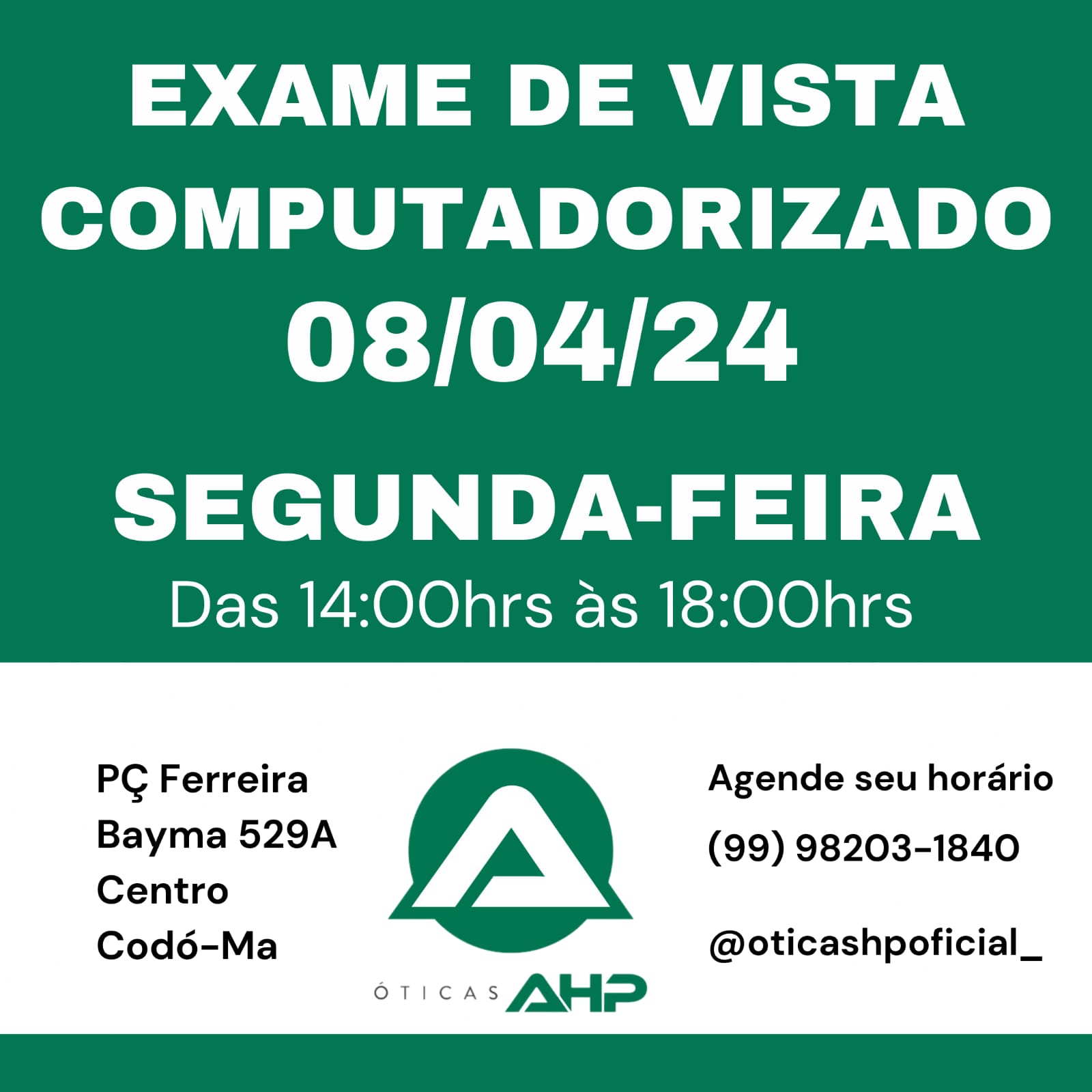 Atenção! As Óticas HP realizará exames de vista computadorizado na segunda-feira, dia 08 de abril. Aproveite, agende o seu horário e garanta sua consulta grátis (na compra dos óculos), das 14h às 18h. Óticas AHP – Praça Ferreira Bayma 529A Centro, Codó-MA. Telefone (99) 98203-1840.