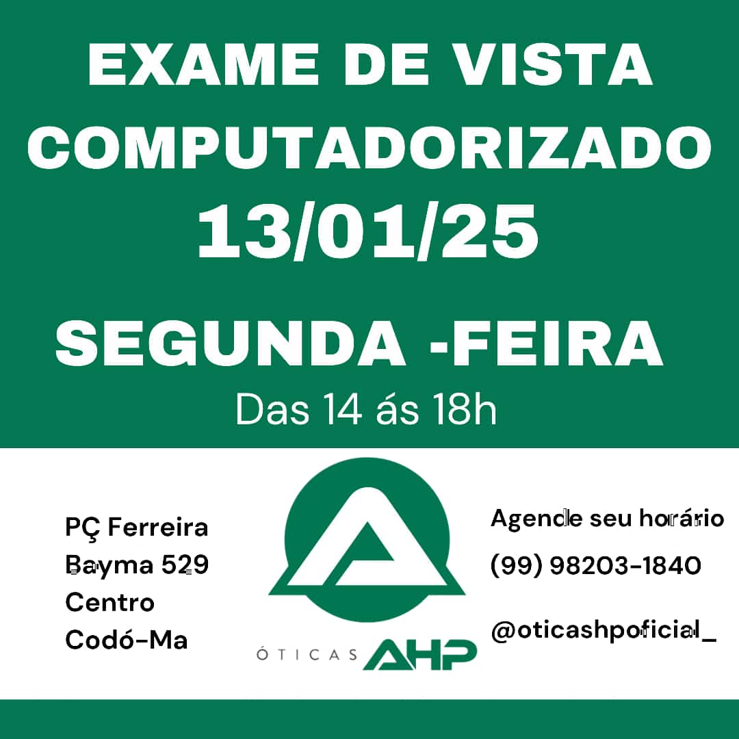 Atenção!! As Óticas HP agora realizará exames de vista computadorizado nas segundas e quintas-feiras. Dia 13 de janeiro haverá consulta. Aproveite, agende o seu horário e garanta sua consulta grátis (na compra dos óculos), das 14h às 18h. Óticas AHP – Praça Ferreira Bayma 529A Centro, Codó-MA. Telefone (99) 98203-1840.