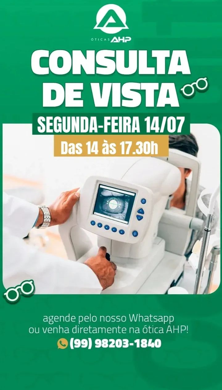 Atenção!! As Óticas AHP agora realizará exames de vista nas segundas e quintas-feiras. Dia 14 de julho haverá consulta. Aproveite, agende o seu horário. Facilitamos sua consulta na compra do óculos aqui nas Óticas AHP. Óticas AHP – Praça Ferreira Bayma 529A Centro, Codó-MA. Telefone (99) 98203-1840.