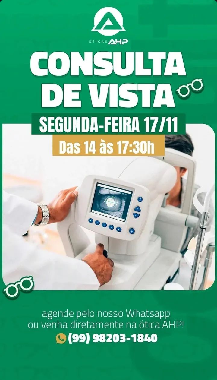 Atenção!! As Óticas AHP agora realizará exames de vista nas segundas-feiras. Dia 17 de novembro haverá consulta. Aproveite, agende o seu horário. Facilitamos sua consulta na compra do óculos aqui nas Óticas AHP. Óticas AHP – Praça Ferreira Bayma 529A Centro, Codó-MA. Telefone (99) 98203-1840.