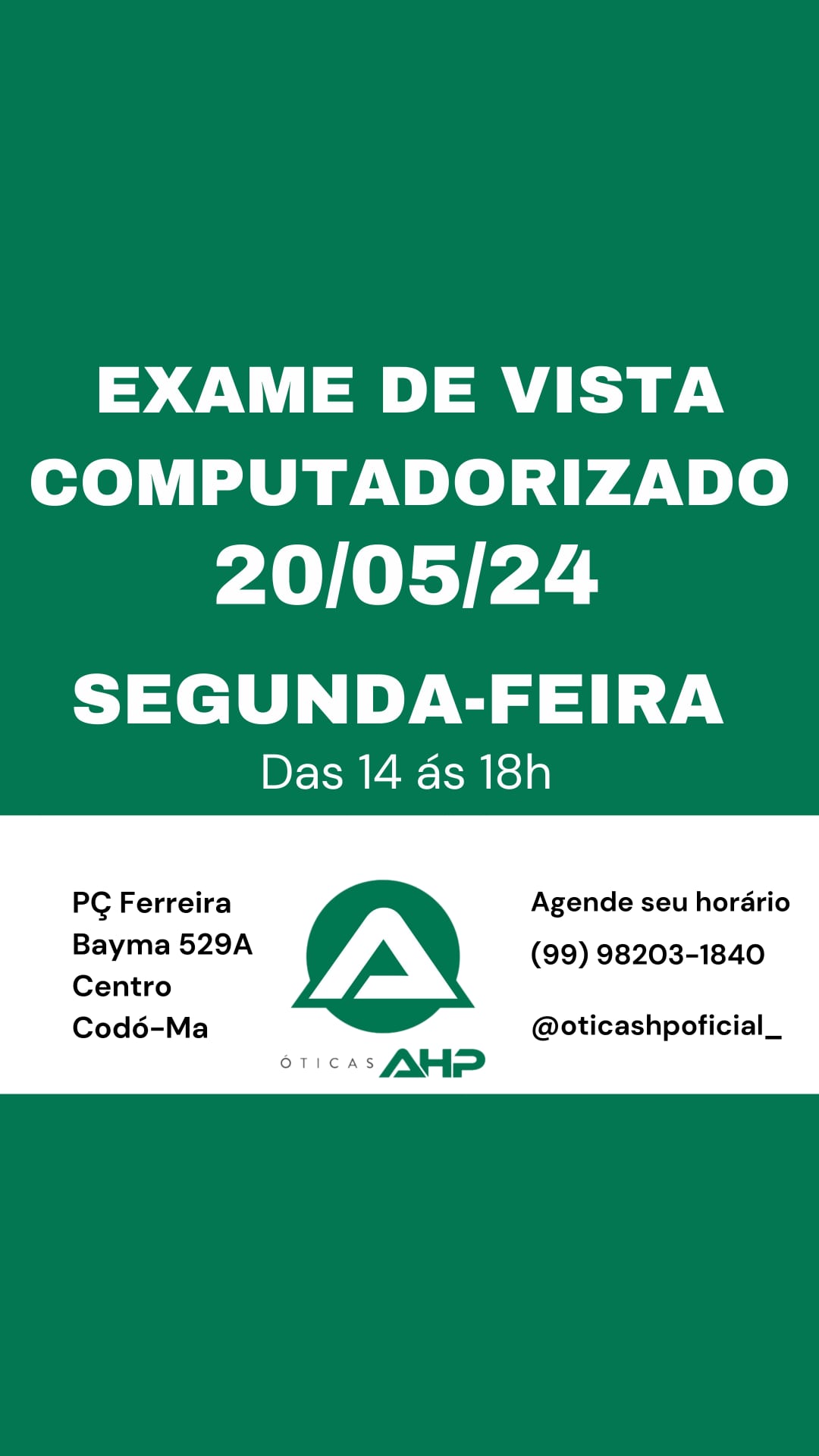 Atenção! As Óticas HP realizará exames de vista computadorizado na segunda-feira, dia 20 de maio. Aproveite, agende o seu horário e garanta sua consulta grátis (na compra dos óculos), das 14h às 18h. Óticas AHP – Praça Ferreira Bayma 529A Centro, Codó-MA. Telefone (99) 98203-1840.