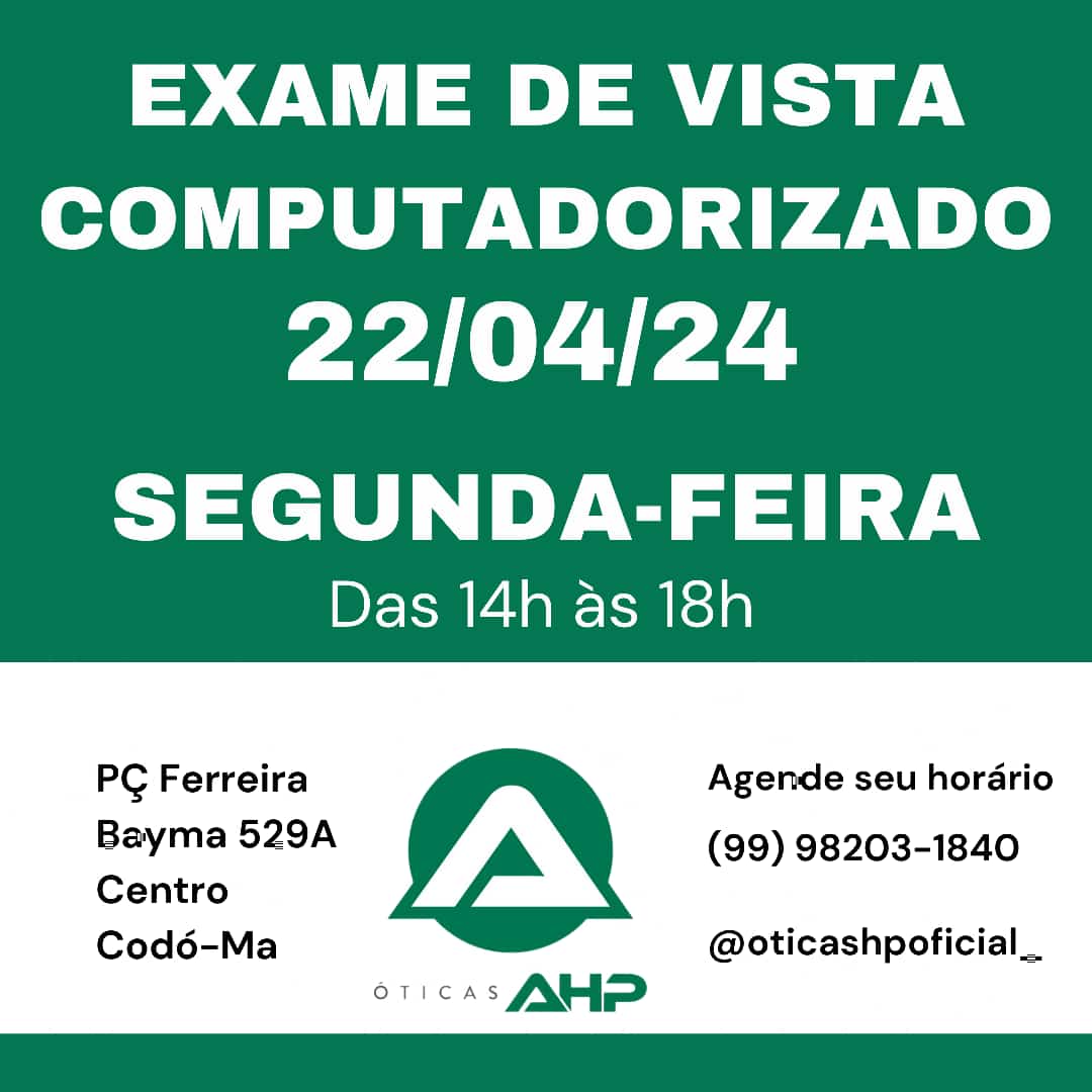 Atenção! As Óticas HP realizará exames de vista computadorizado na segunda-feira, dia 22 de abril. Aproveite, agende o seu horário e garanta sua consulta grátis (na compra dos óculos), das 14h às 18h. Óticas AHP – Praça Ferreira Bayma 529A Centro, Codó-MA. Telefone (99) 98203-1840.