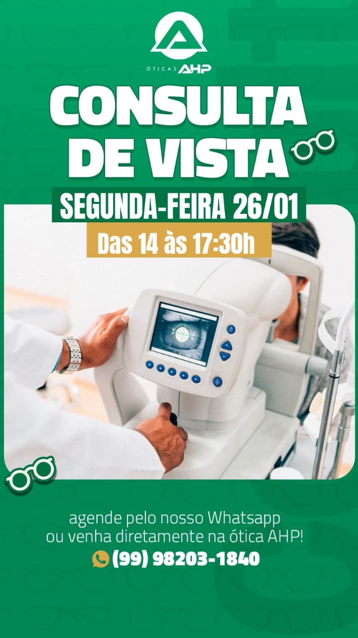 Atenção!! As Óticas AHP agora realizará exames de vista nas segundas-feiras. Dia 26 de janeiro haverá consulta. Aproveite, agende o seu horário. Facilitamos sua consulta na compra do óculos aqui nas Óticas AHP. Óticas AHP – Praça Ferreira Bayma 529A Centro, Codó-MA. Telefone (99) 98203-1840.