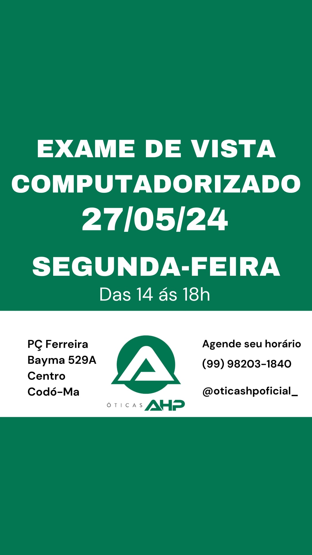 Atenção! ! As Óticas HP realizará exames de vista computadorizado na segunda-feira, dia 27 de maio. Aproveite, agende o seu horário e garanta sua consulta grátis (na compra dos óculos), das 14h às 18h. Óticas AHP – Praça Ferreira Bayma 529A Centro, Codó-MA. Telefone (99) 98203-1840.