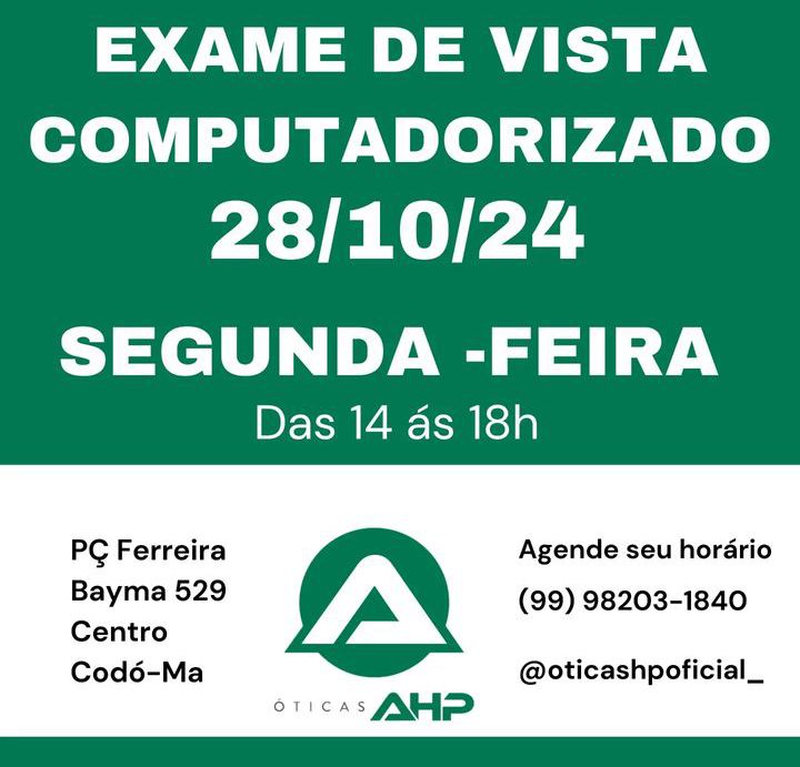 Atenção!! As Óticas HP agora realizará exames de vista computadorizado nas segundas e quintas-feiras. Dia 28 de outubro haverá consulta. Aproveite, agende o seu horário e garanta sua consulta grátis (na compra dos óculos), das 14h às 18h. Óticas AHP – Praça Ferreira Bayma 529A Centro, Codó-MA. Telefone (99) 98203-1840.