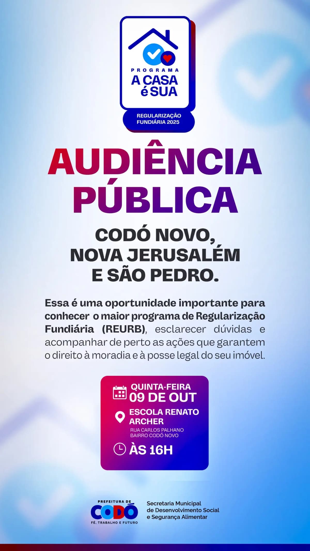 A Prefeitura de Codó, por meio da Secretaria Municipal de Desenvolvimento Social e Segurança Alimentar, realizará nesta quinta-feira (09), às 16h, uma Audiência Pública do programa “A Casa é Sua”, na Escola Renato Archer, localizada na Rua Carlos Palhano, bairro Codó Novo.