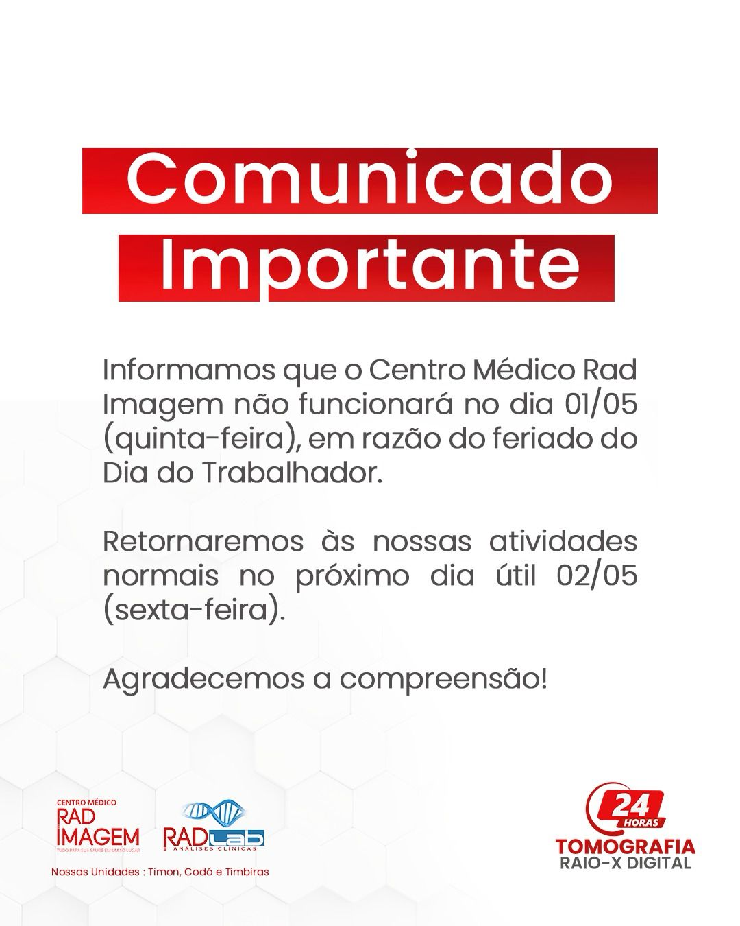 Informamos que o Centro Médico Rad Imagem estará fechado no dia 01 de maio (quinta-feira), em virtude do feriado do Dia do Trabalhador.