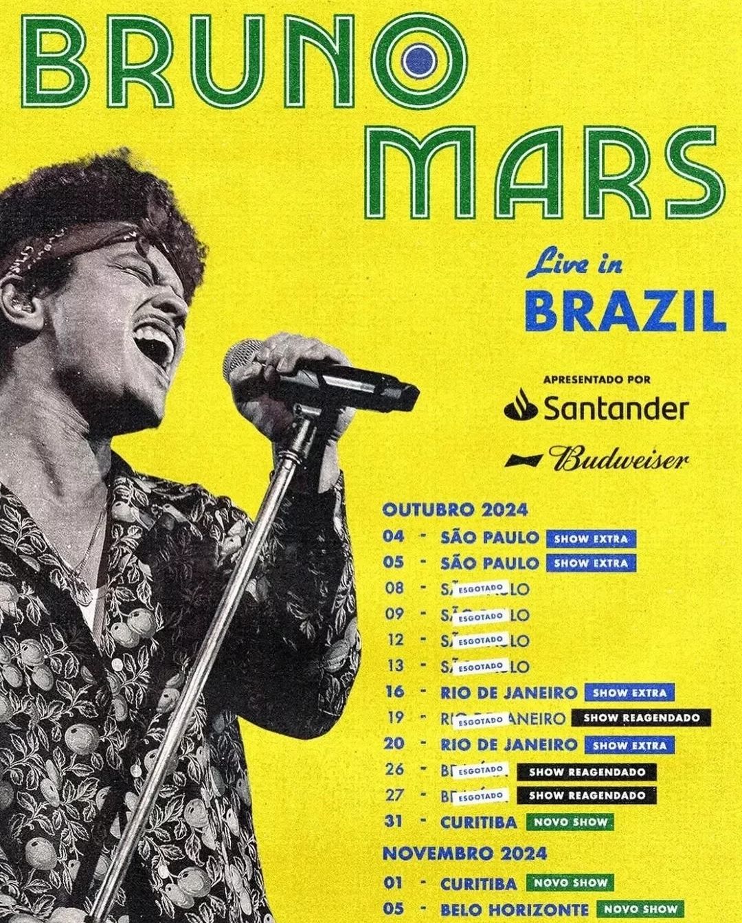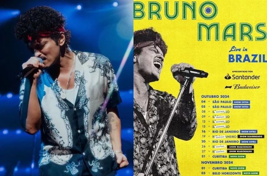 Bruno Mars segue levando os fãs à loucura! O artista confirmou mais sete shows no Brasil. Na tarde desta sexta-feira (17), a produtora responsável pela vinda do famoso, anunciou através de uma postagem no feed, apresentações extras em Curitiba, Belo Horizonte, Rio de Janeiro e São Paulo.