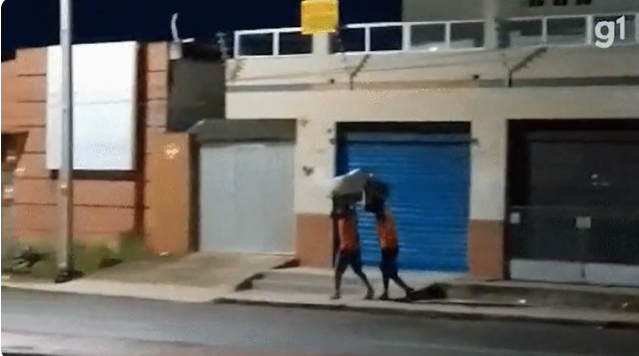 Nas imagens (veja acima), um dos suspeitos aparece no andar superior do imóvel e arremessa o aparelho para o chão. Um pedestre que passava na hora se assusta com a cena. Em seguida, o homem desce do prédio sem demonstrar preocupação com o risco de queda e, junto com o comparsa, que já estava embaixo, pega o ar-condicionado e segue carregando o equipamento na cabeça.