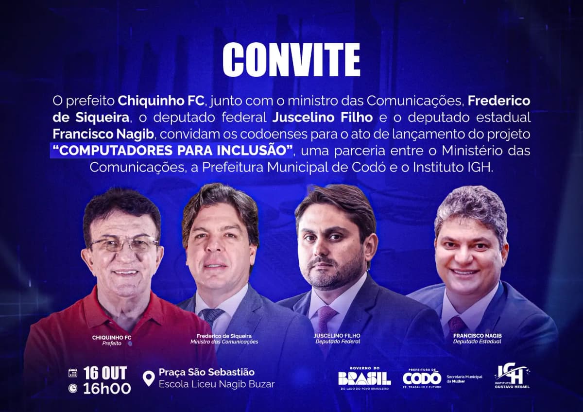 O Ministério das Comunicações, por meio do ministro Frederico de Siqueira Filho, realizará nesta quinta-feira (16), a inauguração do Centro de Recondicionamento de Computadores (CRC) em Codó e o lançamento das atividades da Carreta Digital, projeto itinerante de capacitação tecnológica. A ação integra o programa “Computadores para Inclusão”, do Governo Federal, em parceria com o Instituto Gustavo Hessel (IGH) e apoio da Prefeitura de Codó.