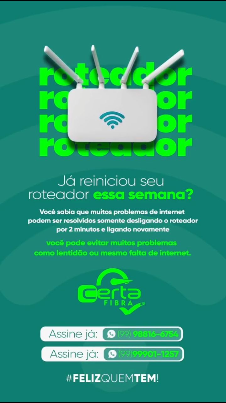 Certa Fibra: Já reiniciou seu roteador essa semana? Publicado em: 19 de abril de 2024Autor: Alberto BarrosDeixe um Comentário! Já reiniciou seu roteador essa semana? Você sabia que muitos problemas de internet podem ser resolvidos somente desligando o roteador por 2 minutos e ligando novamente. Você pode evitar muitos problemas como lentidão ou mesmo falta de internet.