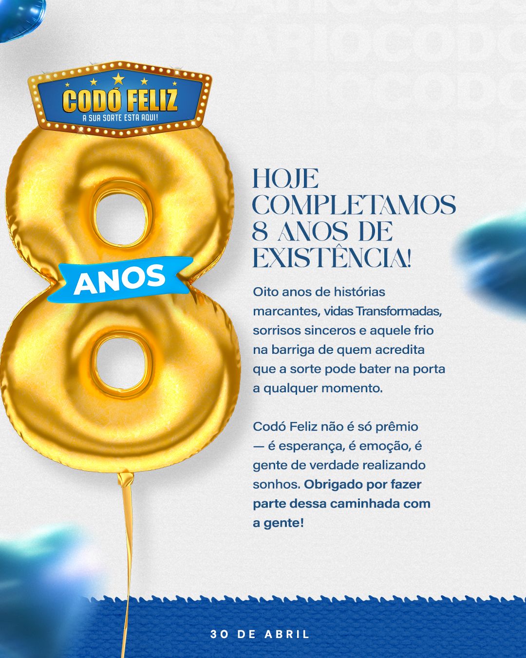 Hoje é dia de festa no Codó Feliz! Completamos 8 anos de existência, e cada um desses anos foi marcado por histórias incríveis, vidas transformadas, sorrisos sinceros e aquele frio na barriga de quem acredita que a sorte pode bater à porta a qualquer momento.