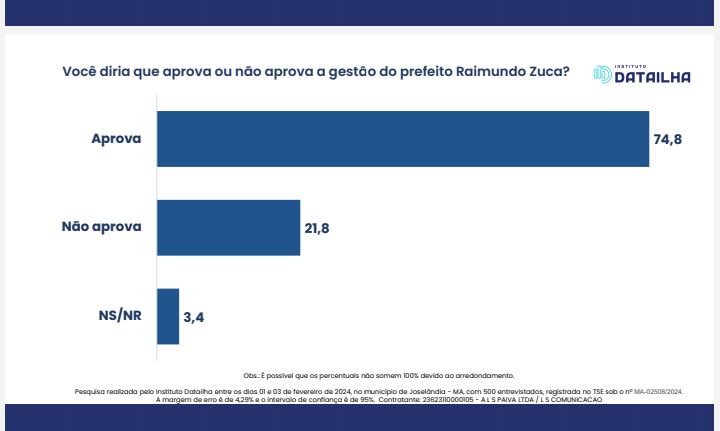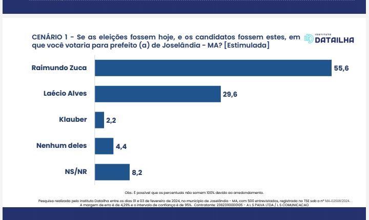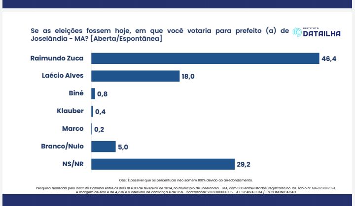 Pesquisa realizada pelo Instituto Datailha entre os dias 01 e 03 de fevereiro de 2024, no município de Joselândia – MA, com 500 entrevistados, registrada no TSE sob o nº MA-02508/2024. A margem de erro é de 4,29% e o intervalo de confiança é de 95%. Contratante: 23623110000105 – A L S PAIVA LTDA / L S COMUNICACAO
