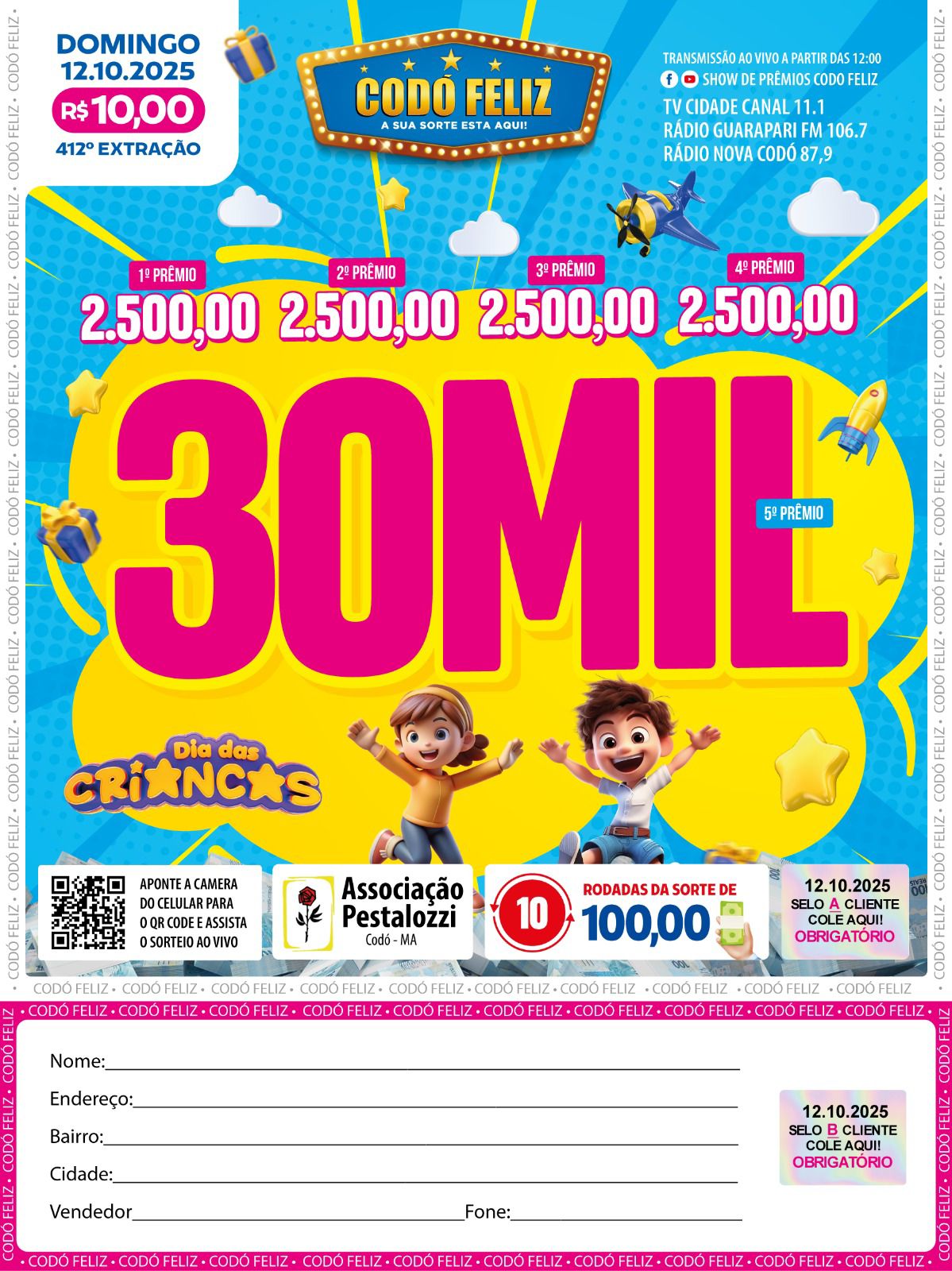 Compre já a sua cartela do Codó Feliz, especial Dia das Crianças e concorra a R$ 41 Mil Reais - Blog do Alberto Barros