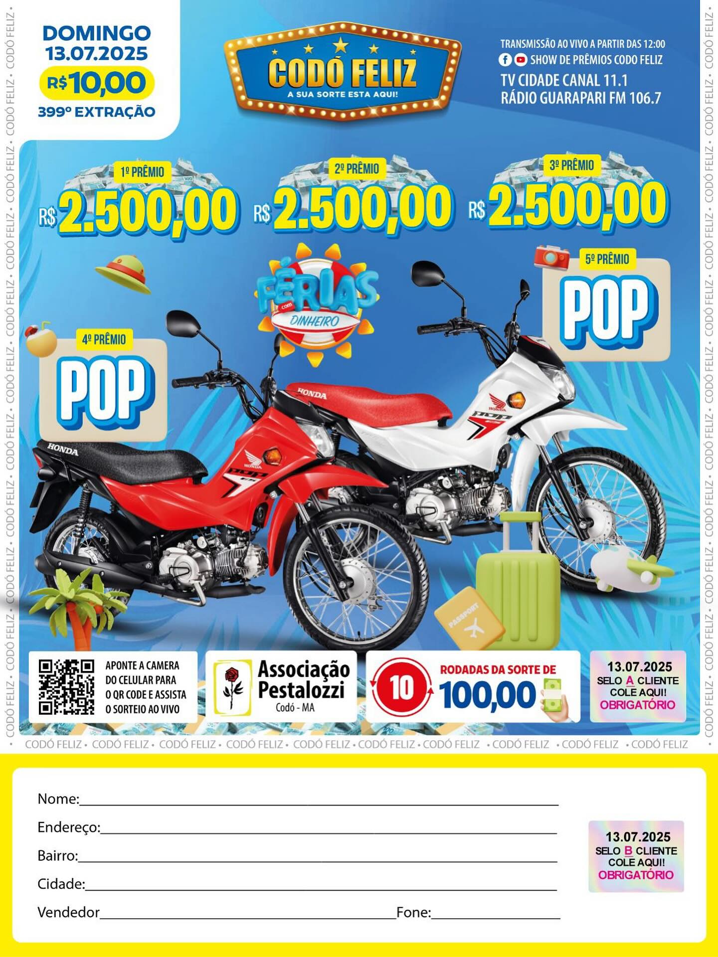 Compre já sua cartela do Codó Feliz e concorra a duas POPs 0km e mais R$ 8.500,00 em prêmios - Blog do Alberto Barros