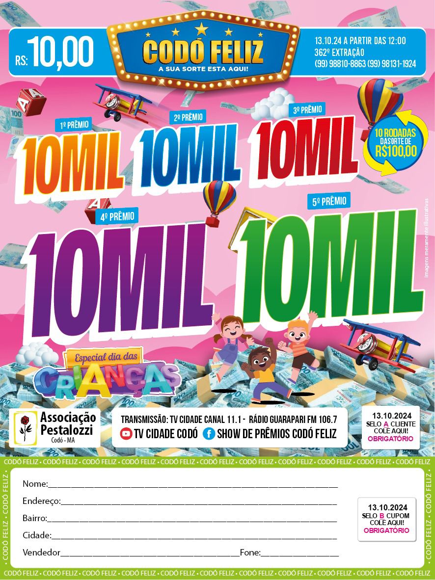 Compre já sua cartela do Codó Feliz especial Dia das Crianças e concorra a R$ 51 Mil reais em prêmios - Blog do Alberto Barros