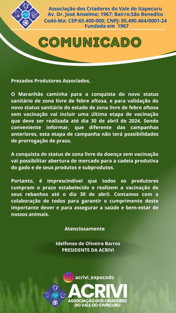 Prezados produtores associados, o Maranhão caminha para a conquista do novo status sanitário de zona livre de febre aftosa, e para a validação do novo status sanitário do estado de zona livre de febre aftosa (sem vacinação), teremos uma última etapa de vacinação, que vai ser realizada até o dia 30 de abril de 2024, sendo conveniente informar que: diferente das campanhas anteriores, essa etapa de campanha não terá possibilidades de prorrogação de prazo.