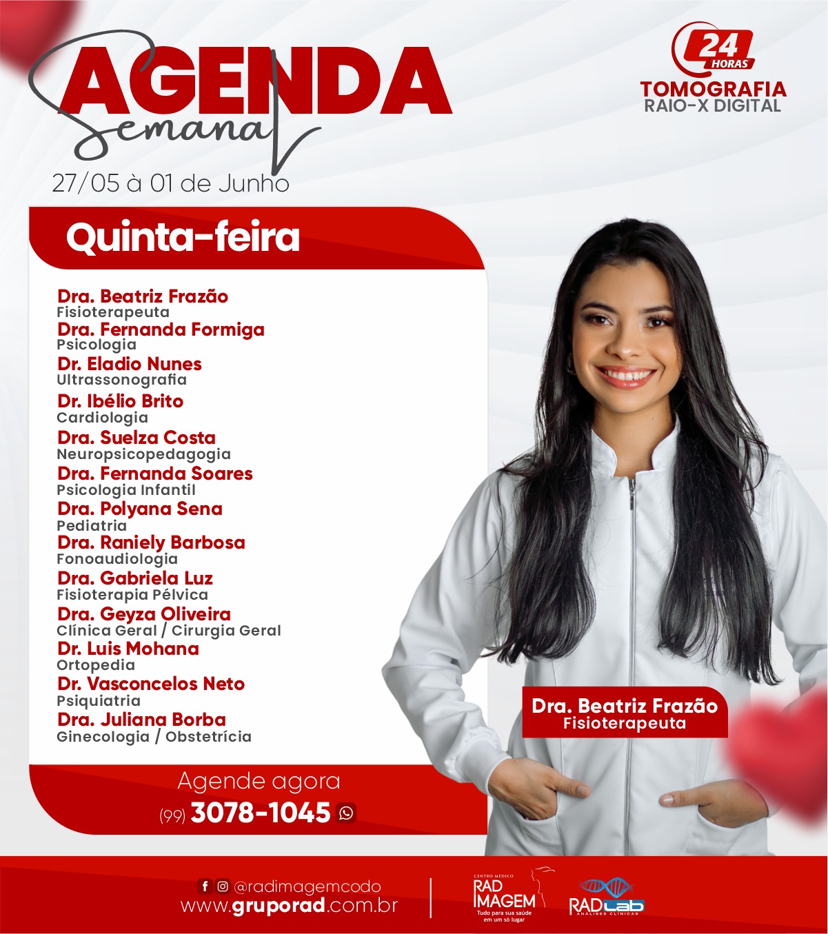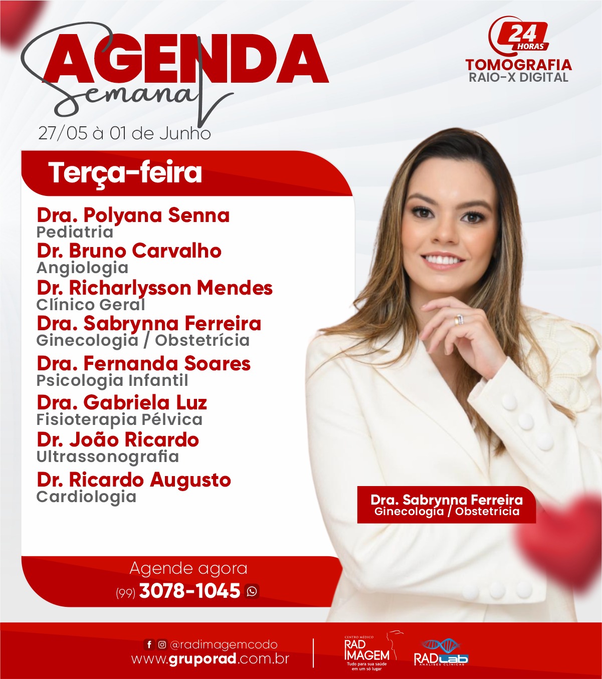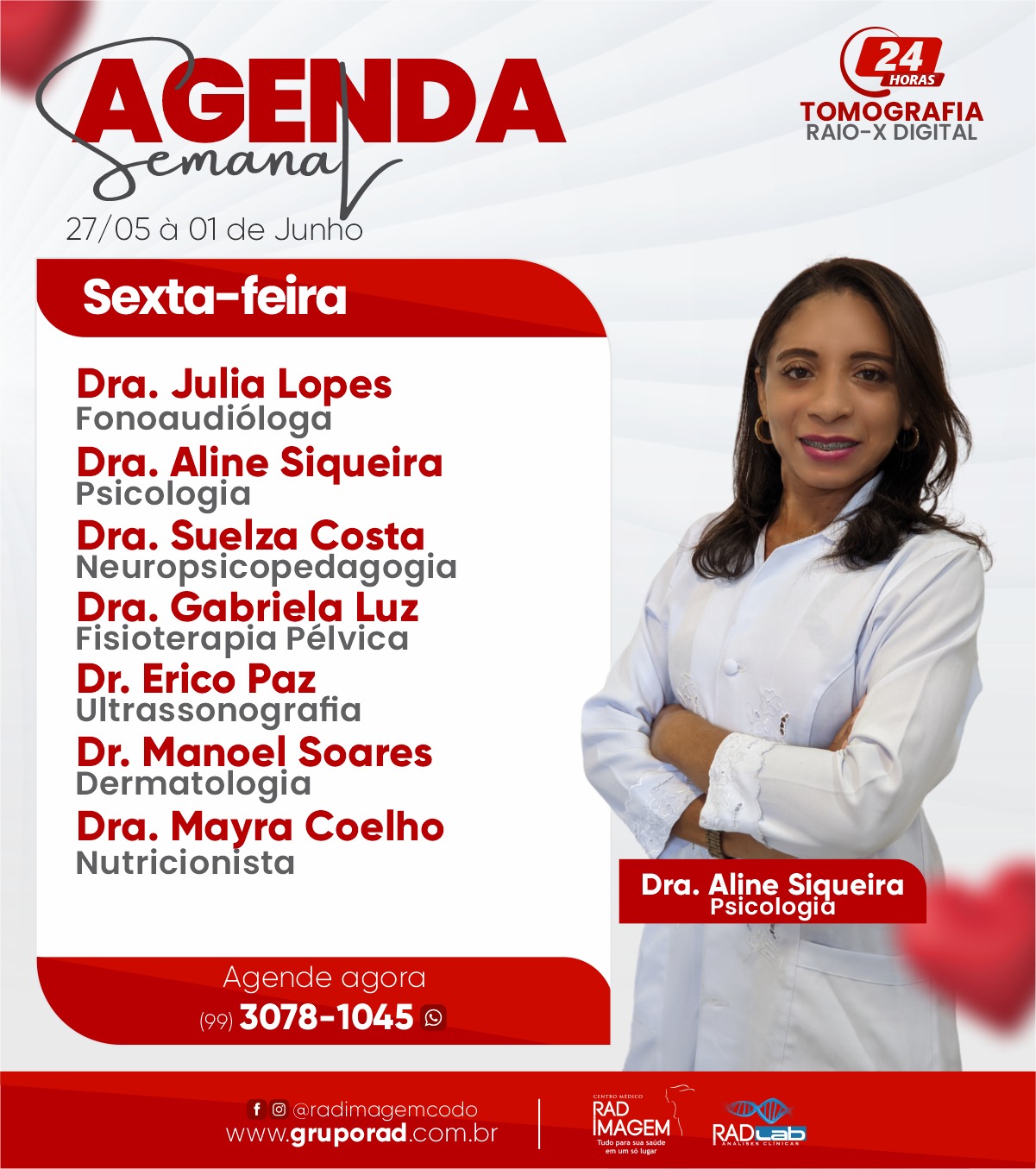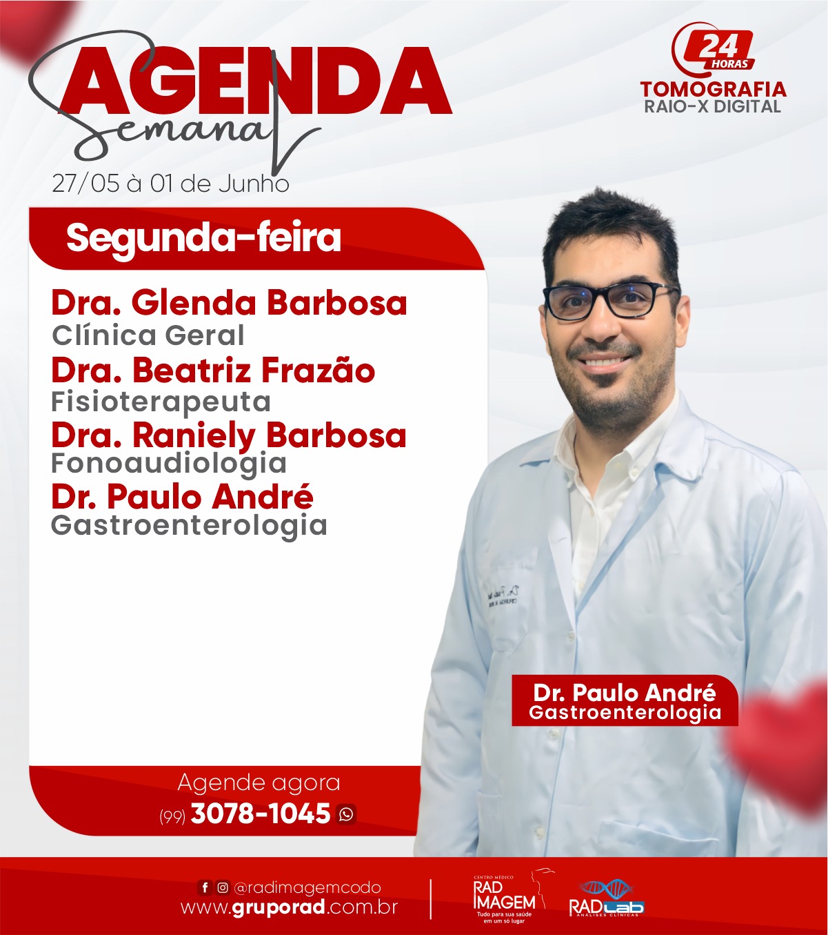 Confira a agenda de atendimentos na Rad Imagem em Codó Publicado em: 26 de maio de 2024Autor: Alberto BarrosDeixe um Comentário! Confira a agenda de atendimentos da semana (de 27 de maio à 01 de junho ) da Rad Imagem em Codó.