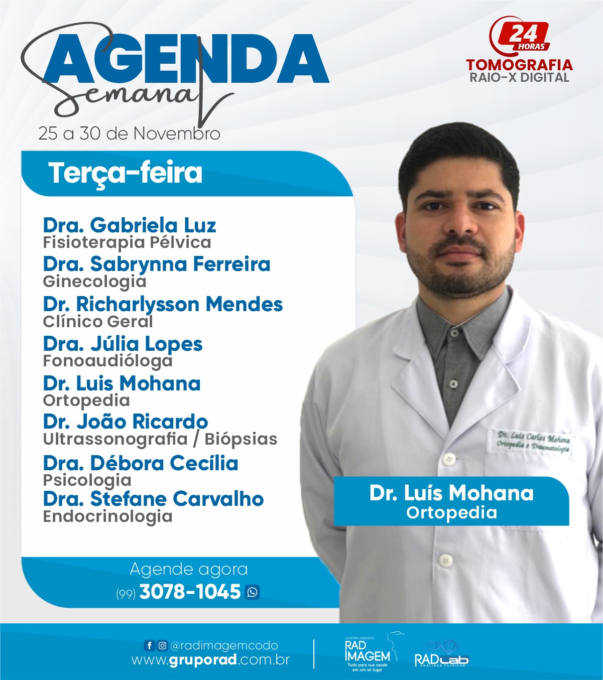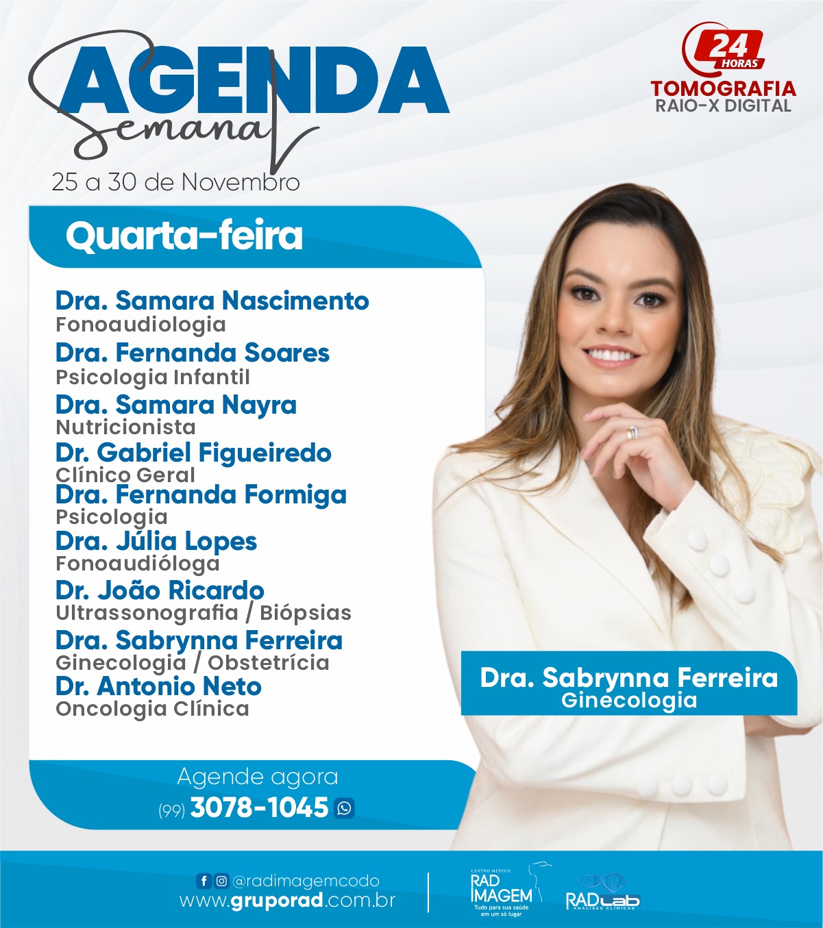 Confira a agenda de atendimentos na Rad Imagem em Codó Publicado em: 25 de novembro de 2024Autor: Alberto BarrosDeixe um Comentário! Confira a agenda de atendimentos da semana (de 25 à 30 de novembro) da Rad Imagem em Codó.
