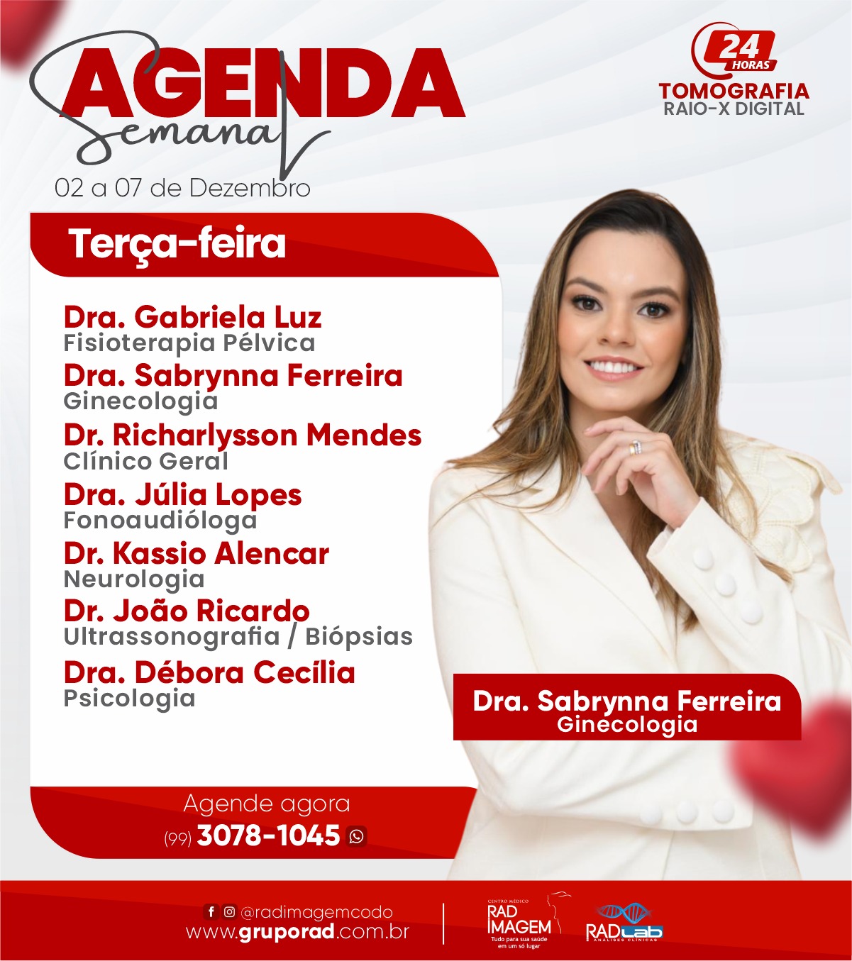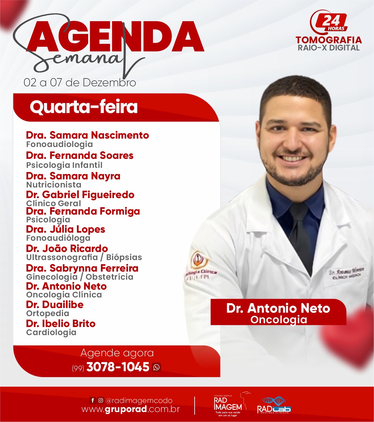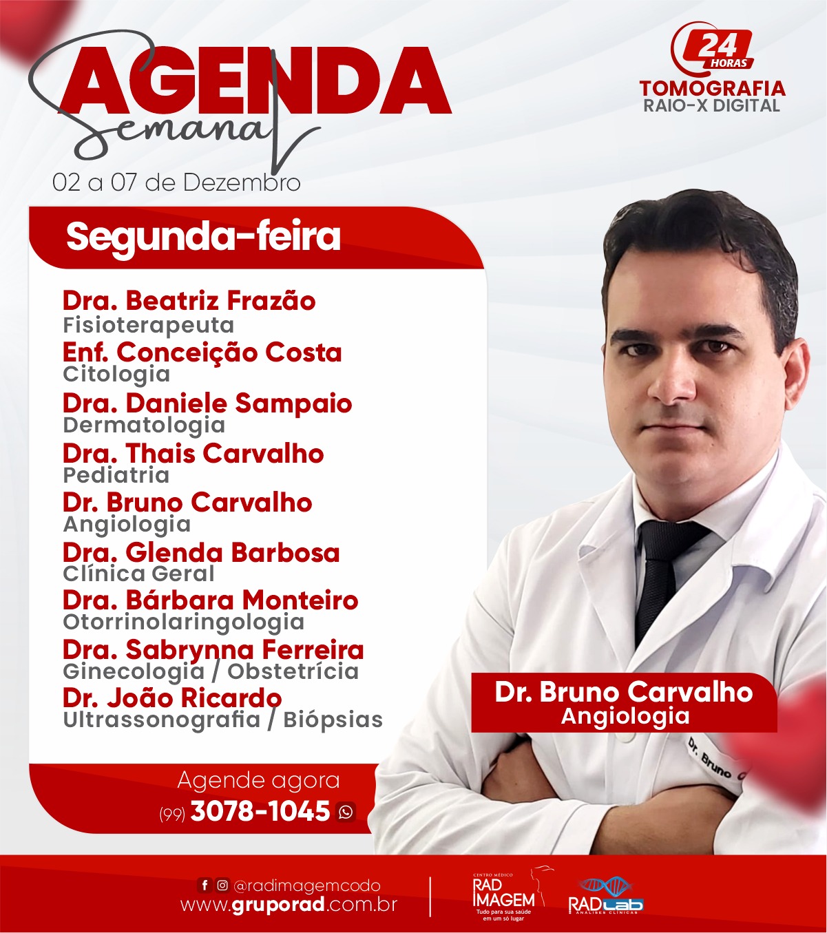 Confira a agenda de atendimentos na Rad Imagem em Codó Publicado em: 2 de dezembro de 2024Autor: Alberto BarrosDeixe um Comentário! Confira a agenda de atendimentos da semana (de 02 à 07 de dezembro) da Rad Imagem em Codó.