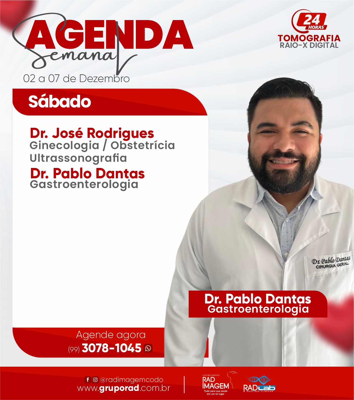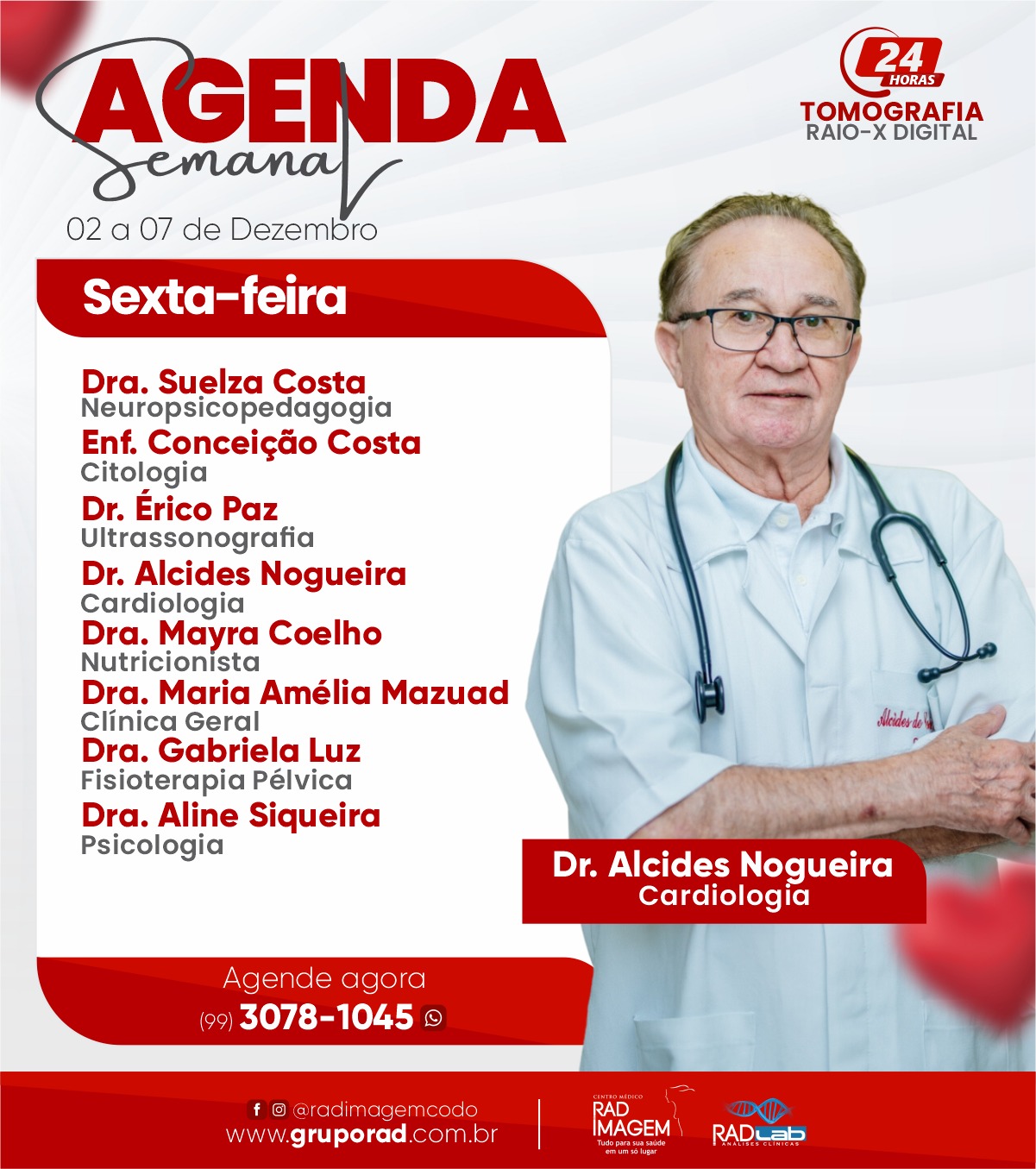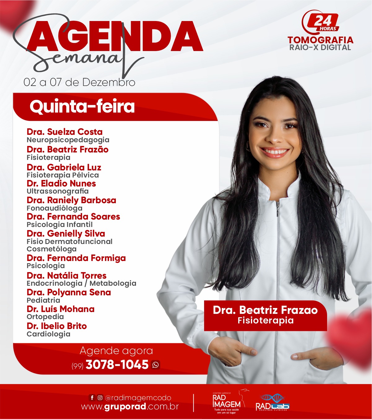 Confira a agenda de atendimentos na Rad Imagem em Codó Publicado em: 2 de dezembro de 2024Autor: Alberto BarrosDeixe um Comentário! Confira a agenda de atendimentos da semana (de 02 à 07 de dezembro) da Rad Imagem em Codó.