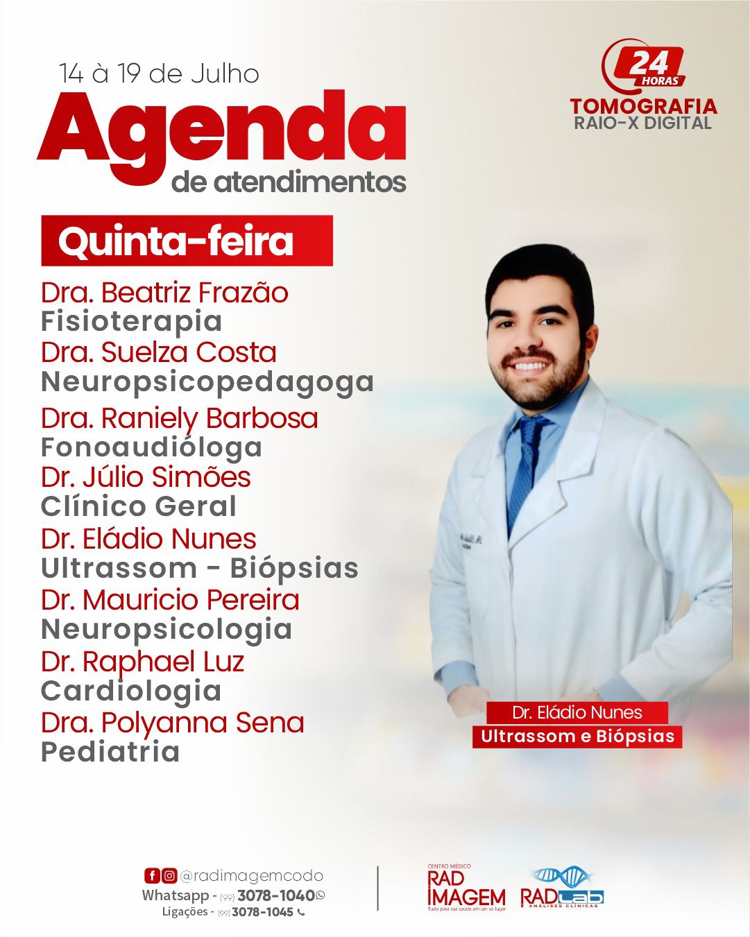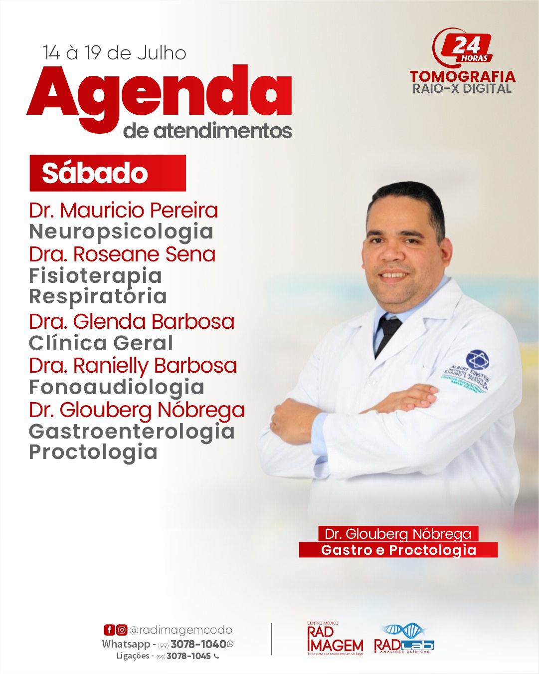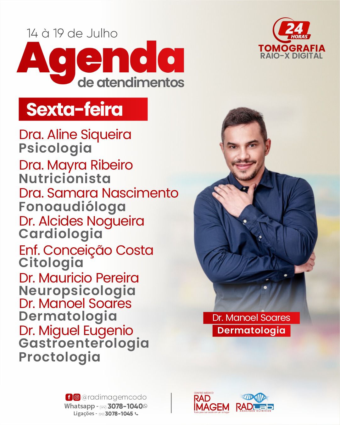 Confira a agenda de atendimentos na Rad Imagem em Codó Publicado em: 17 de julho de 2025Autor: Alberto BarrosDeixe um Comentário! Confira a agenda de atendimentos na Rad Imagem em Codó; semana (de 14 à 19 de julho).