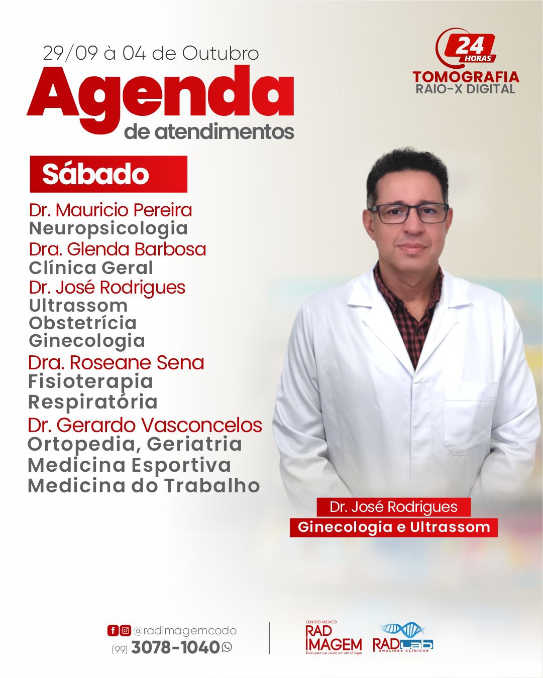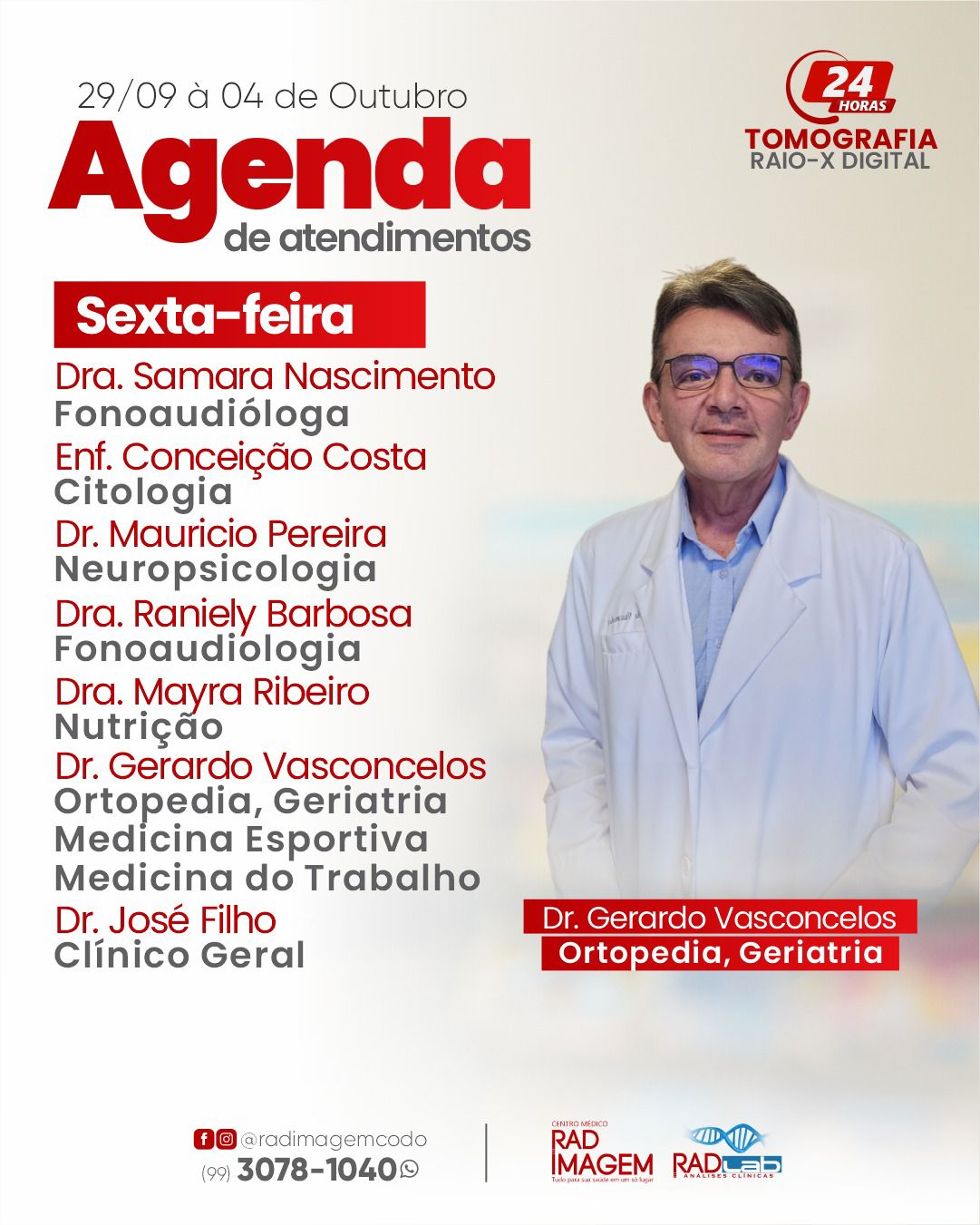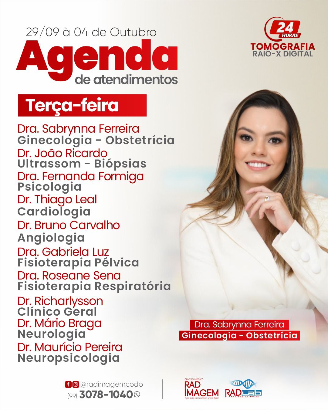 Confira a agenda de atendimentos na Rad Imagem em Codó Publicado em: 29 de setembro de 2025Autor: Alberto BarrosDeixe um Comentário! Confira a agenda de atendimentos na Rad Imagem em Codó; semana (de 29 de setembro à 04 de outubro).