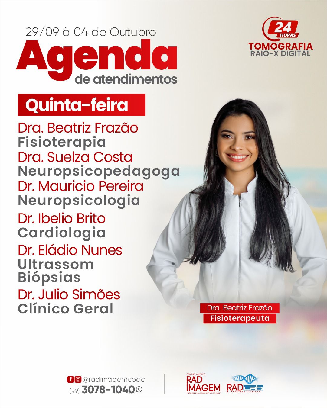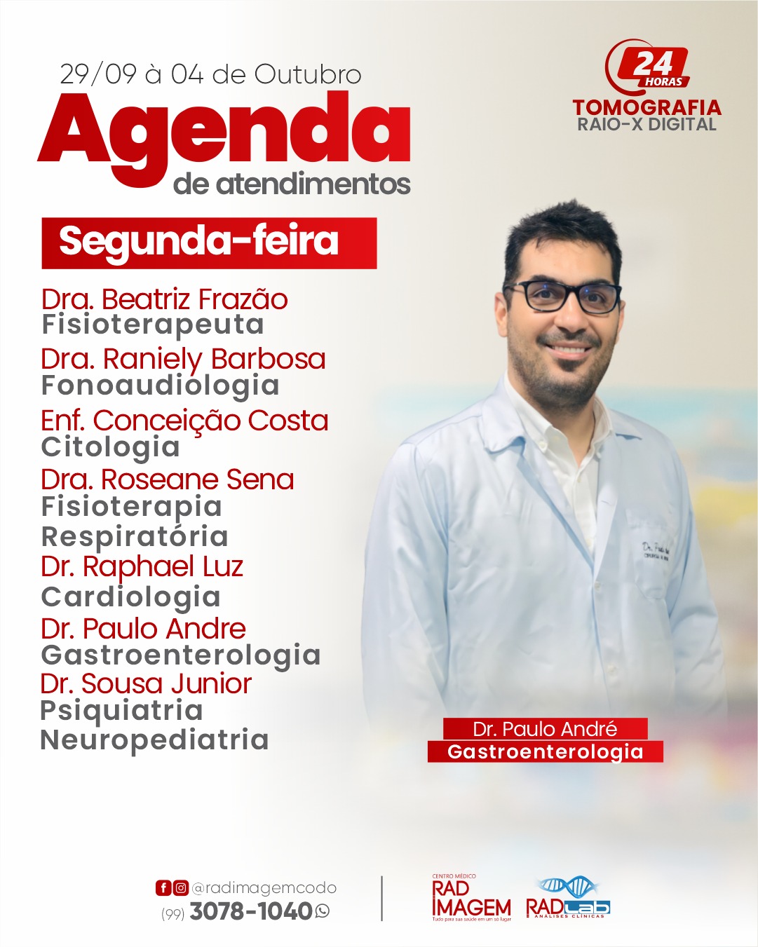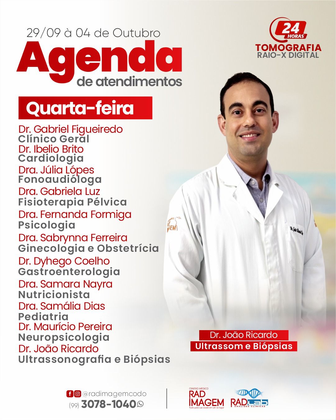 Confira a agenda de atendimentos na Rad Imagem em Codó Publicado em: 29 de setembro de 2025Autor: Alberto BarrosDeixe um Comentário! Confira a agenda de atendimentos na Rad Imagem em Codó; semana (de 29 de setembro à 04 de outubro).