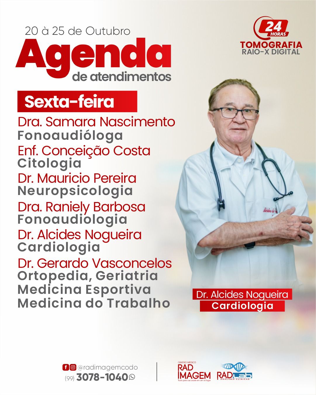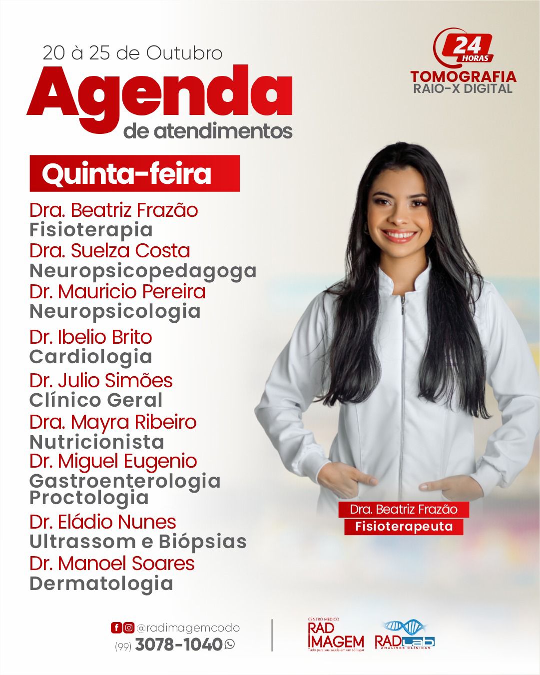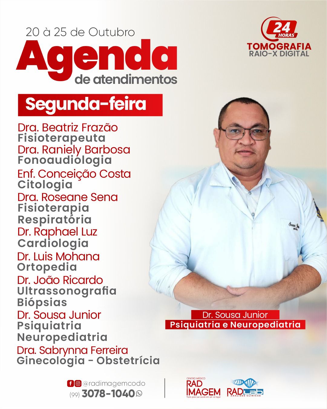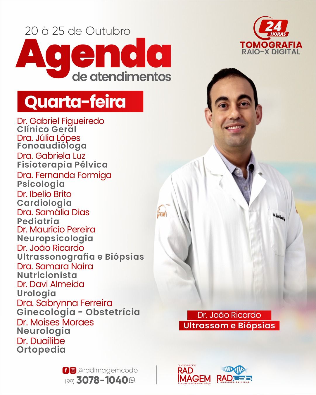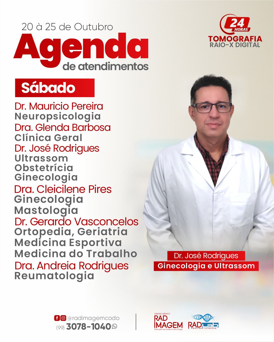 Confira a agenda de atendimentos na Rad Imagem em Codó Publicado em: 20 de outubro de 2025Autor: Alberto BarrosDeixe um Comentário! Confira a agenda de atendimentos na Rad Imagem em Codó; semana (de 20 à 25 de outubro).