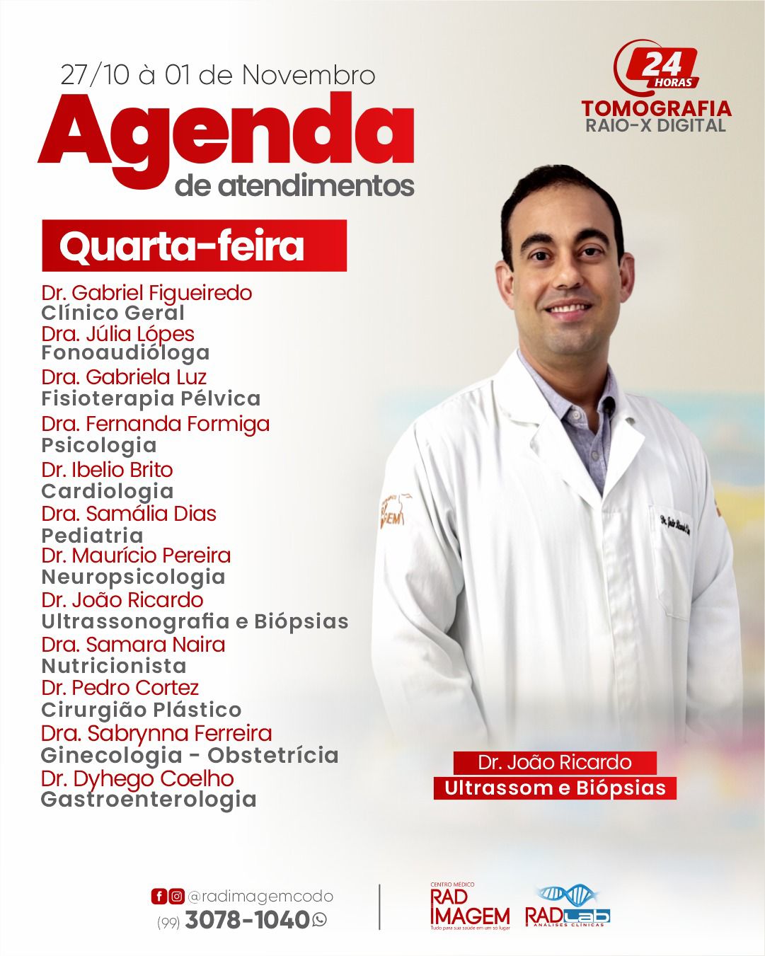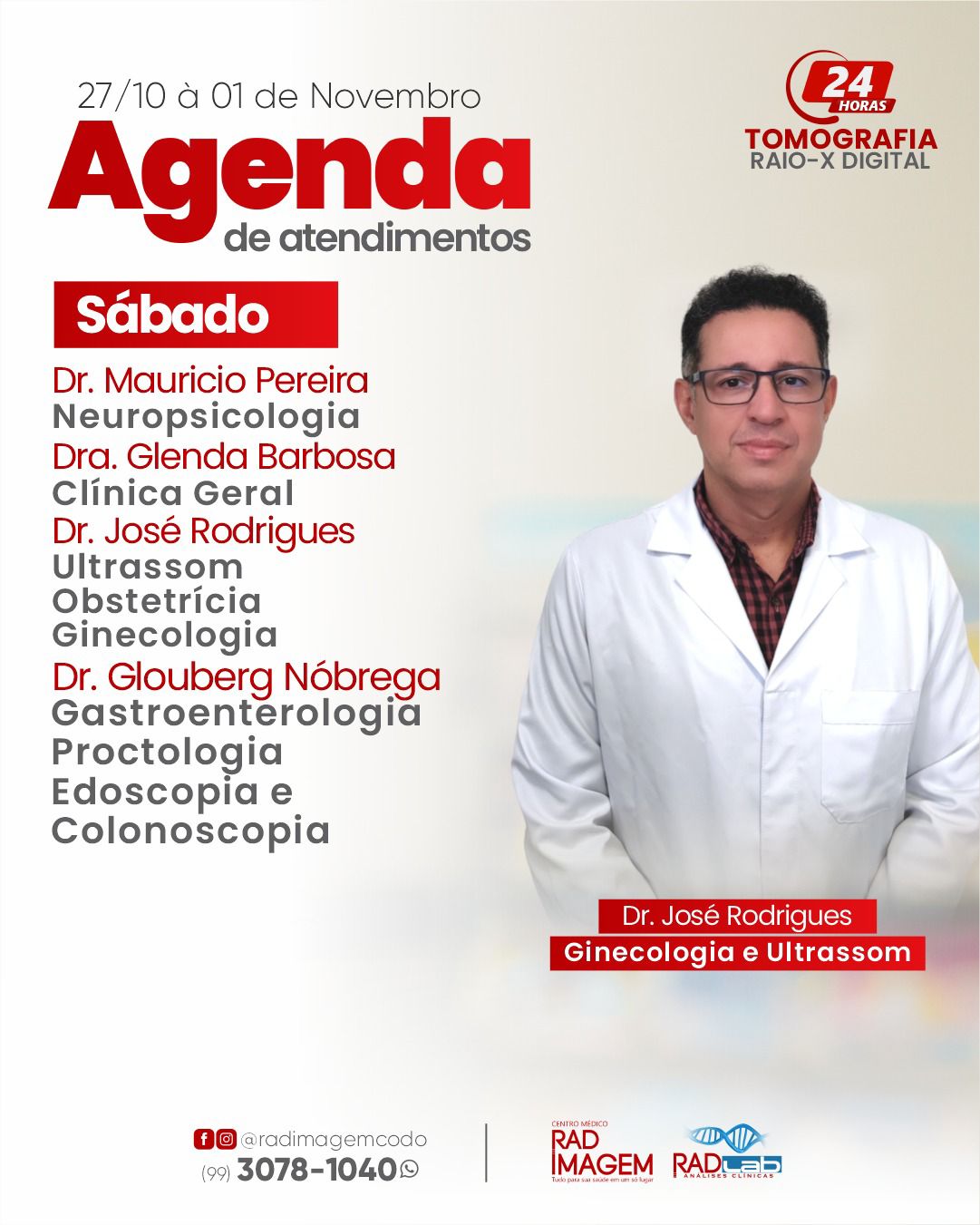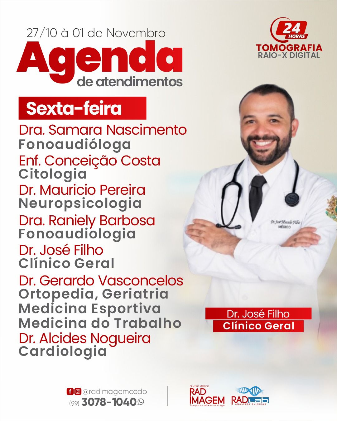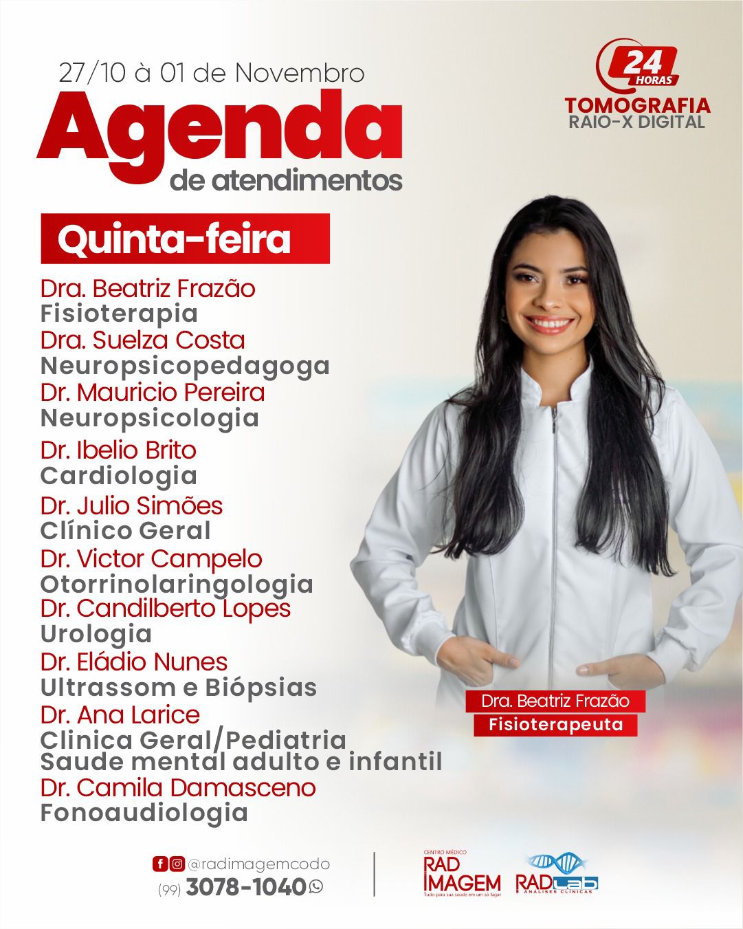 Confira a agenda de atendimentos na Rad Imagem em Codó Publicado em: 29 de outubro de 2025Autor: Alberto BarrosDeixe um Comentário! Confira a agenda de atendimentos na Rad Imagem em Codó; semana (de 27 de outubro a 01 de novembro).