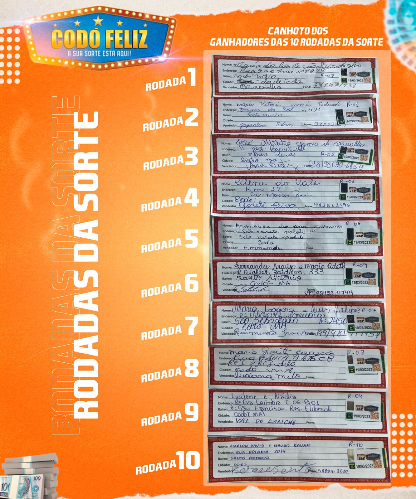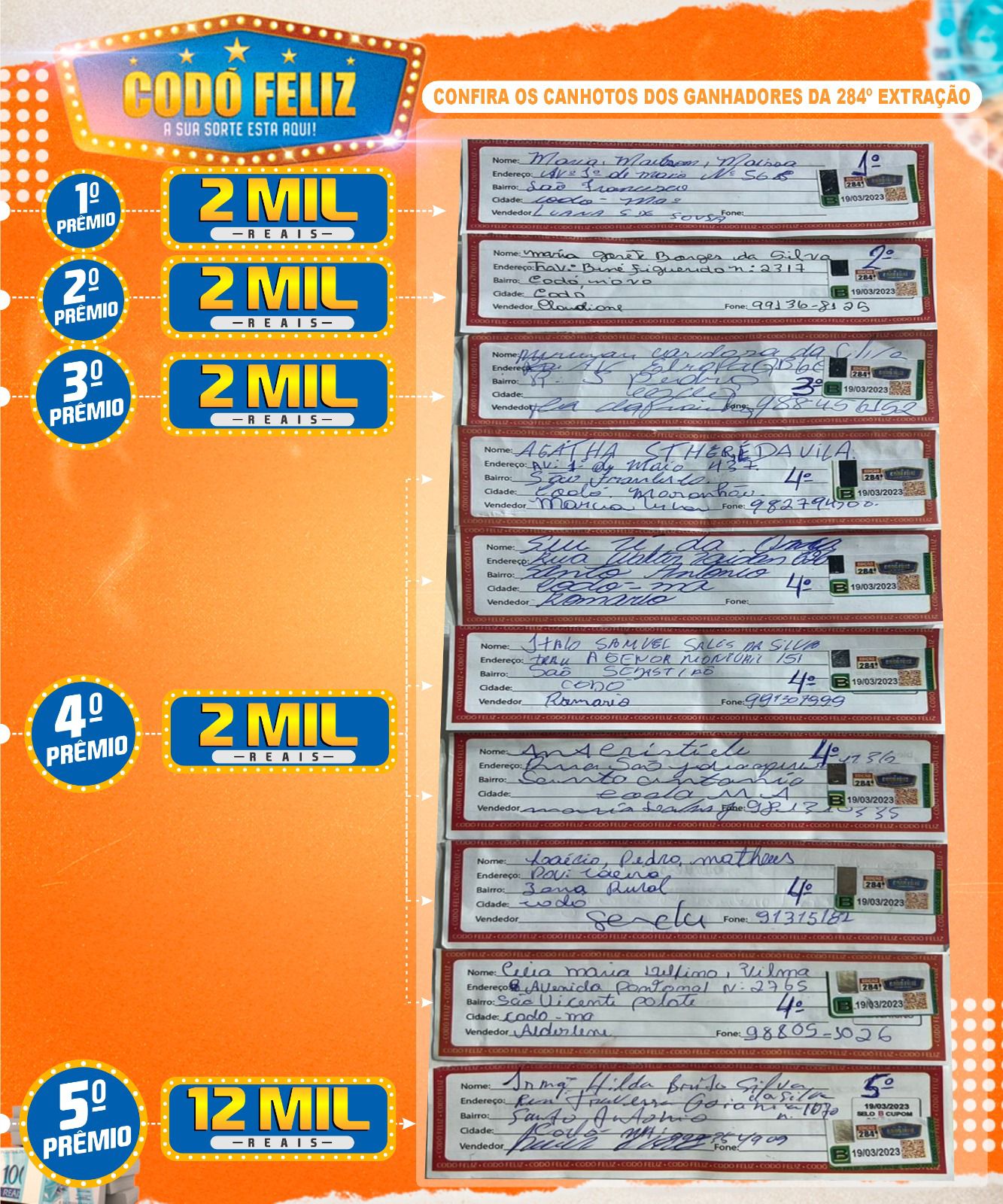Confira os canhotos dos Ganhadores da 284° Extração e das Dez Rodadas da Sorte do Codó Feliz desse domingo 19/03/2023 - Blog do Alberto Barros