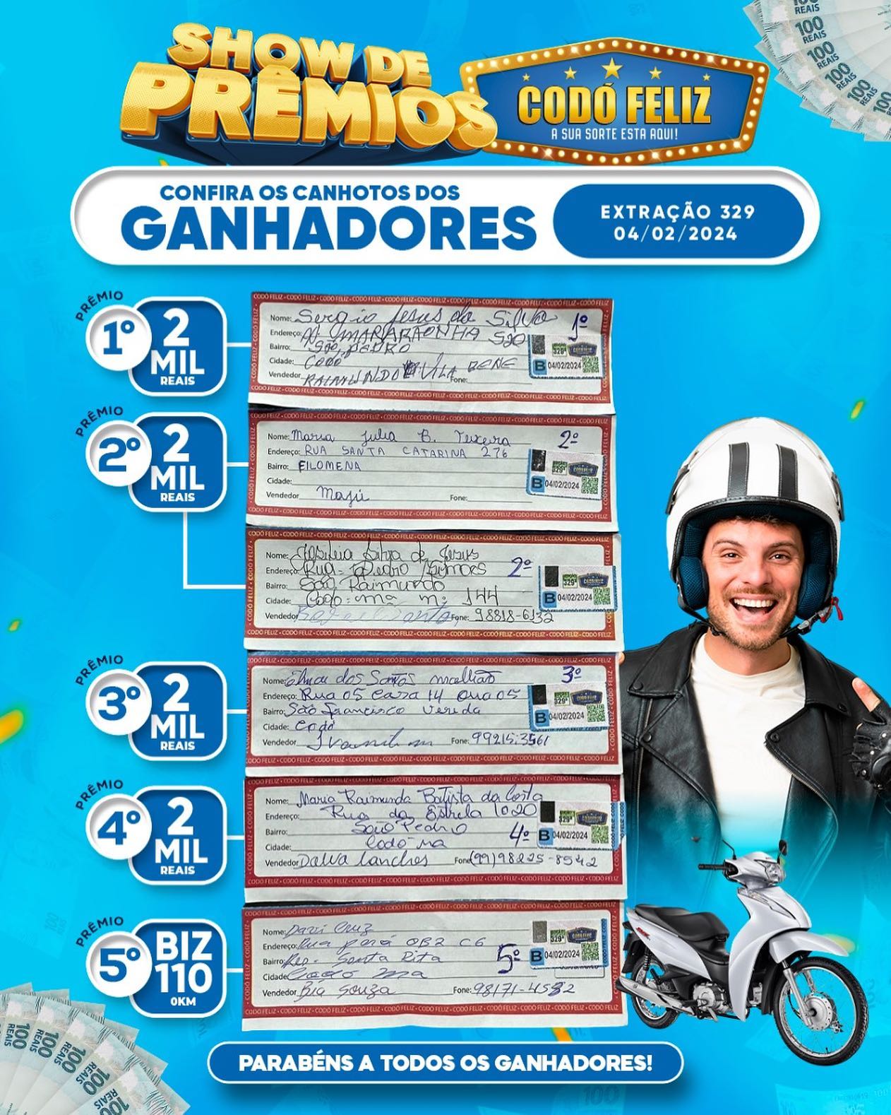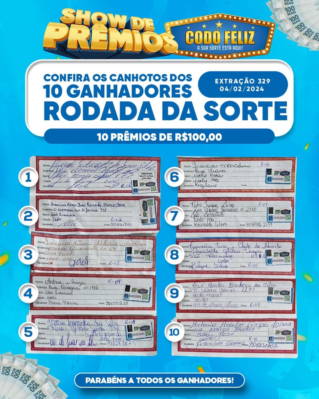 Confira os canhotos dos Ganhadores da 329ª Extração do Codó Feliz desse domingo Publicado em: 4 de fevereiro de 2024Autor: Alberto BarrosDeixe um Comentário!