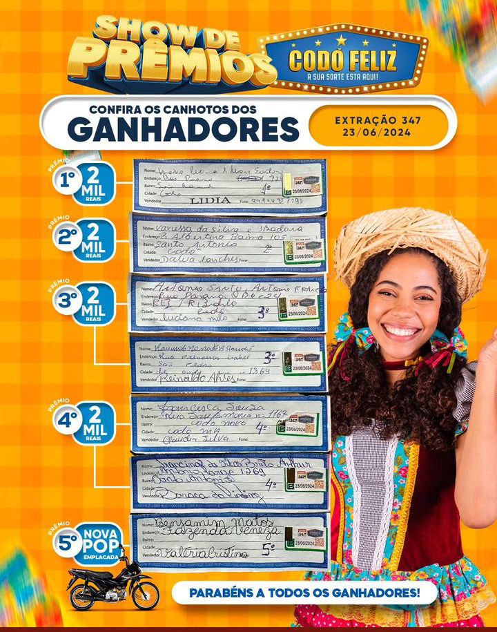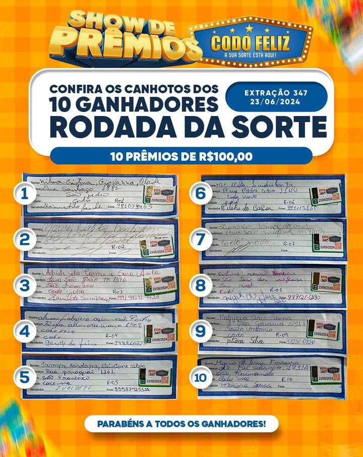 Confira os canhotos dos Ganhadores da 347ª Extração do Codó Feliz desse domingo Publicado em: 23 de junho de 2024Autor: Alberto BarrosDeixe um Comentário!