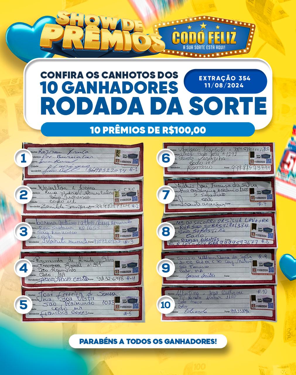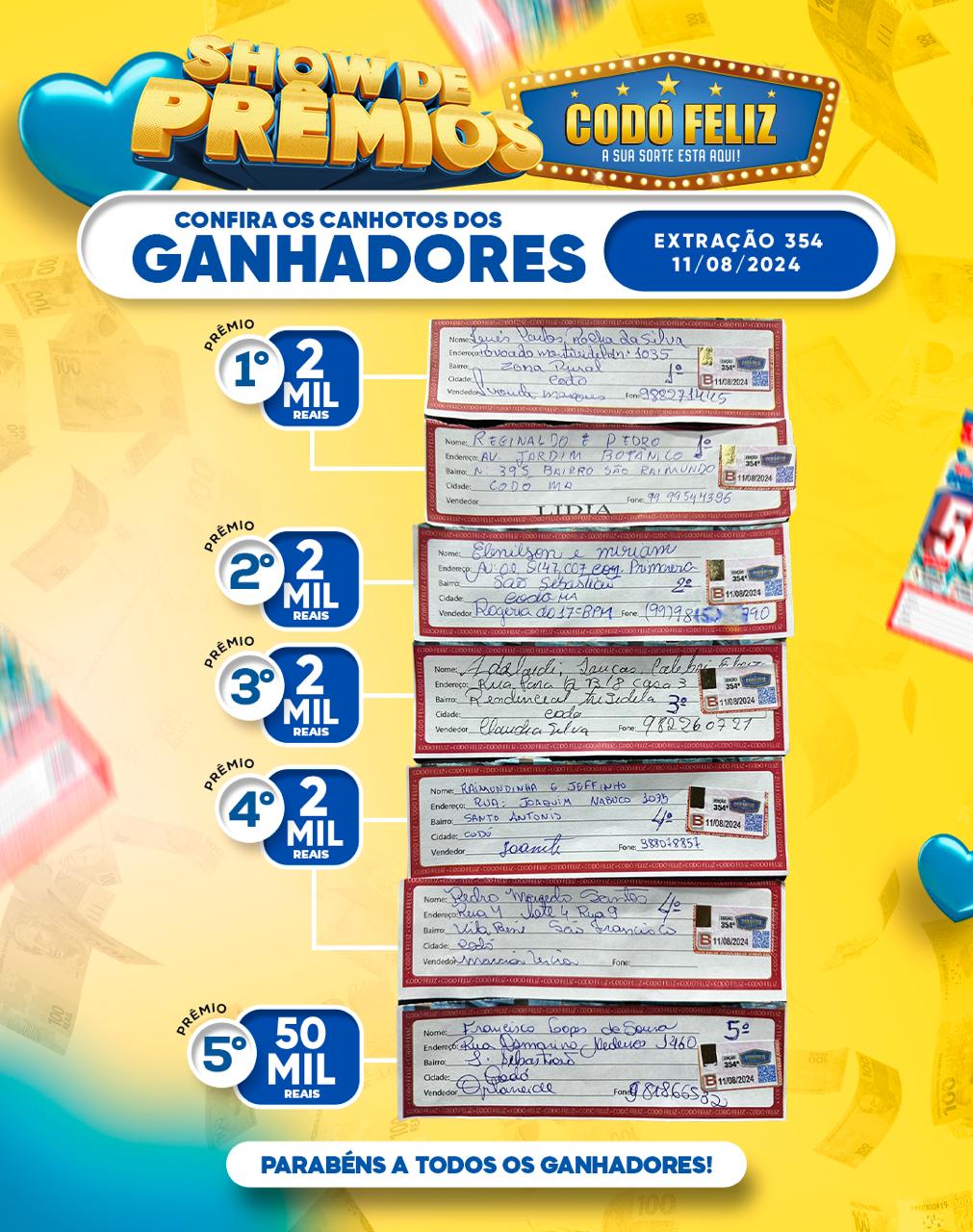 Confira os canhotos dos Ganhadores da 354ª Extração do Codó Feliz desse domingo Publicado em: 12 de agosto de 2024Autor: Alberto BarrosDeixe um Comentário!
