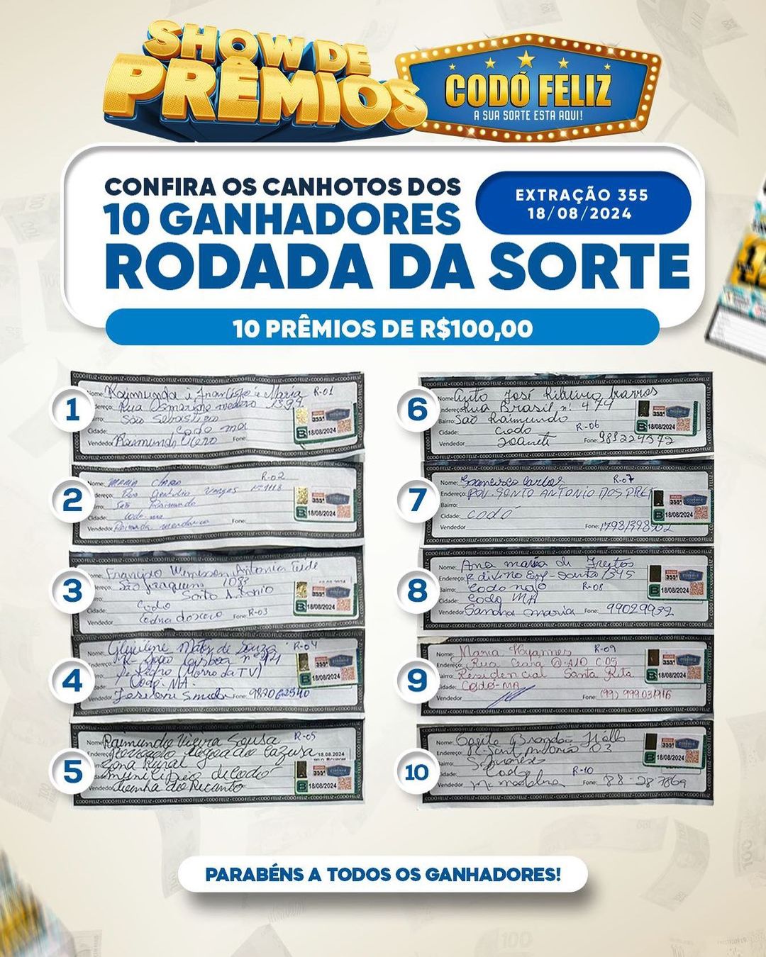 Confira os canhotos dos Ganhadores da 355ª Extração do Codó Feliz desse domingo Publicado em: 18 de agosto de 2024Autor: Alberto BarrosDeixe um Comentário!
