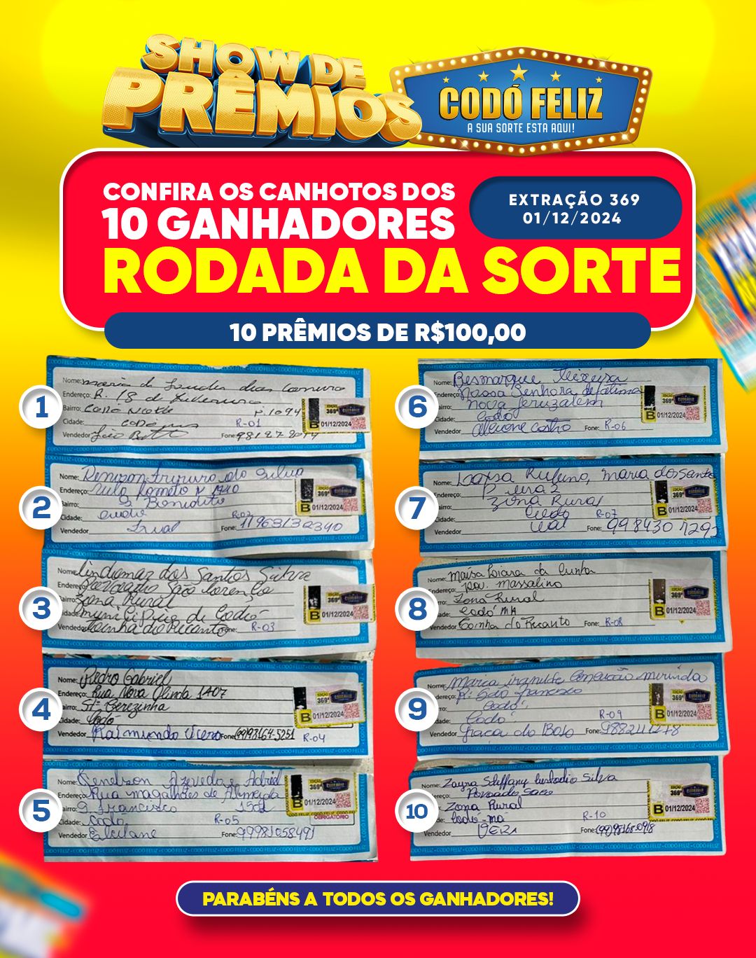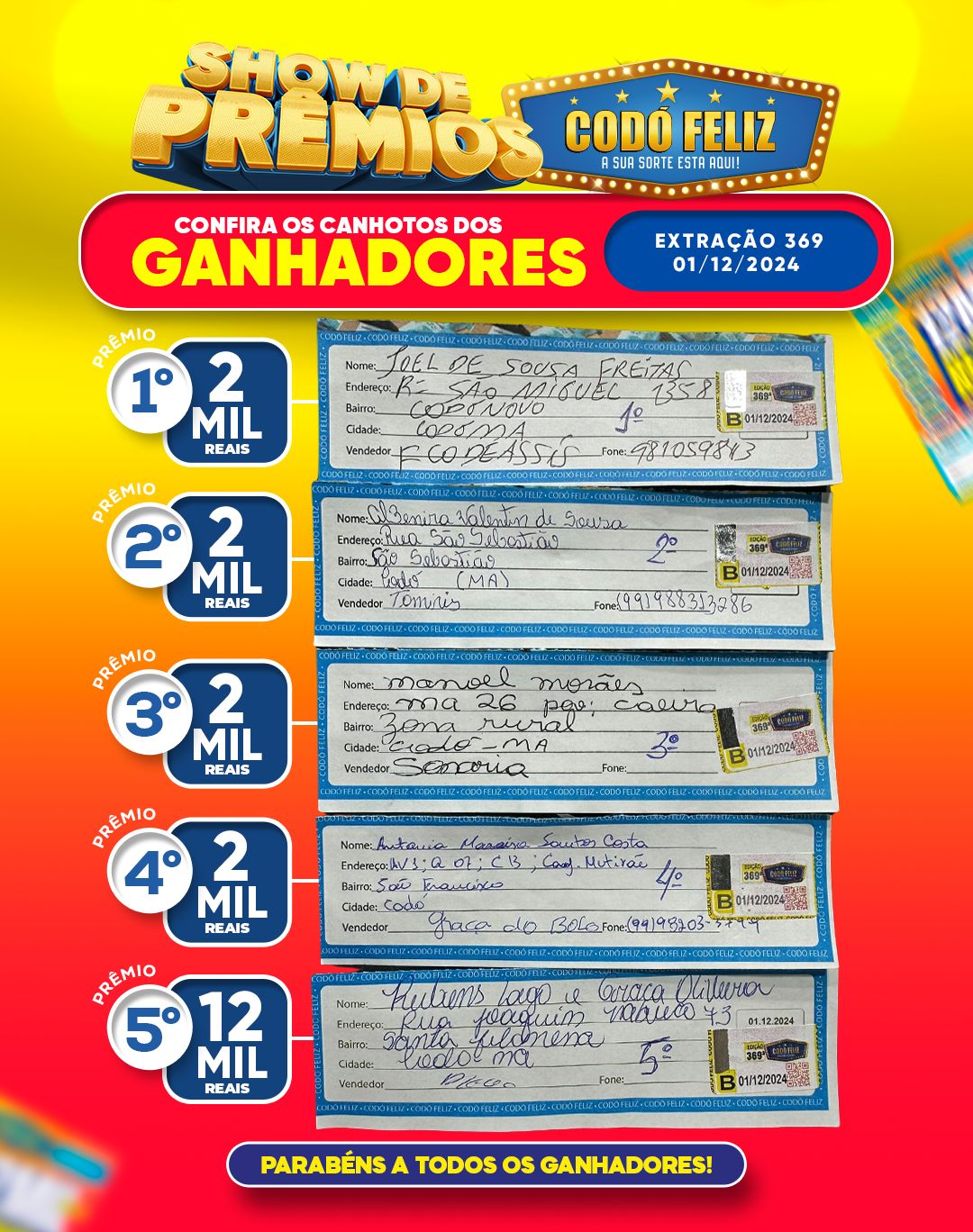 Confira os canhotos dos Ganhadores da 369ª Extração do Codó Feliz desse domingo Publicado em: 2 de dezembro de 2024Autor: Alberto BarrosDeixe um Comentário!