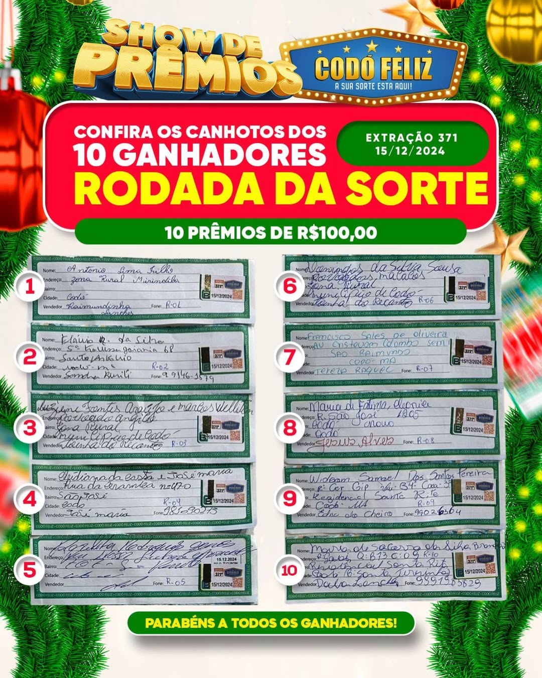 Confira os canhotos dos Ganhadores da 371ª Extração do Codó Feliz desse domingo Publicado em: 16 de dezembro de 2024Autor: Alberto BarrosDeixe um Comentário!