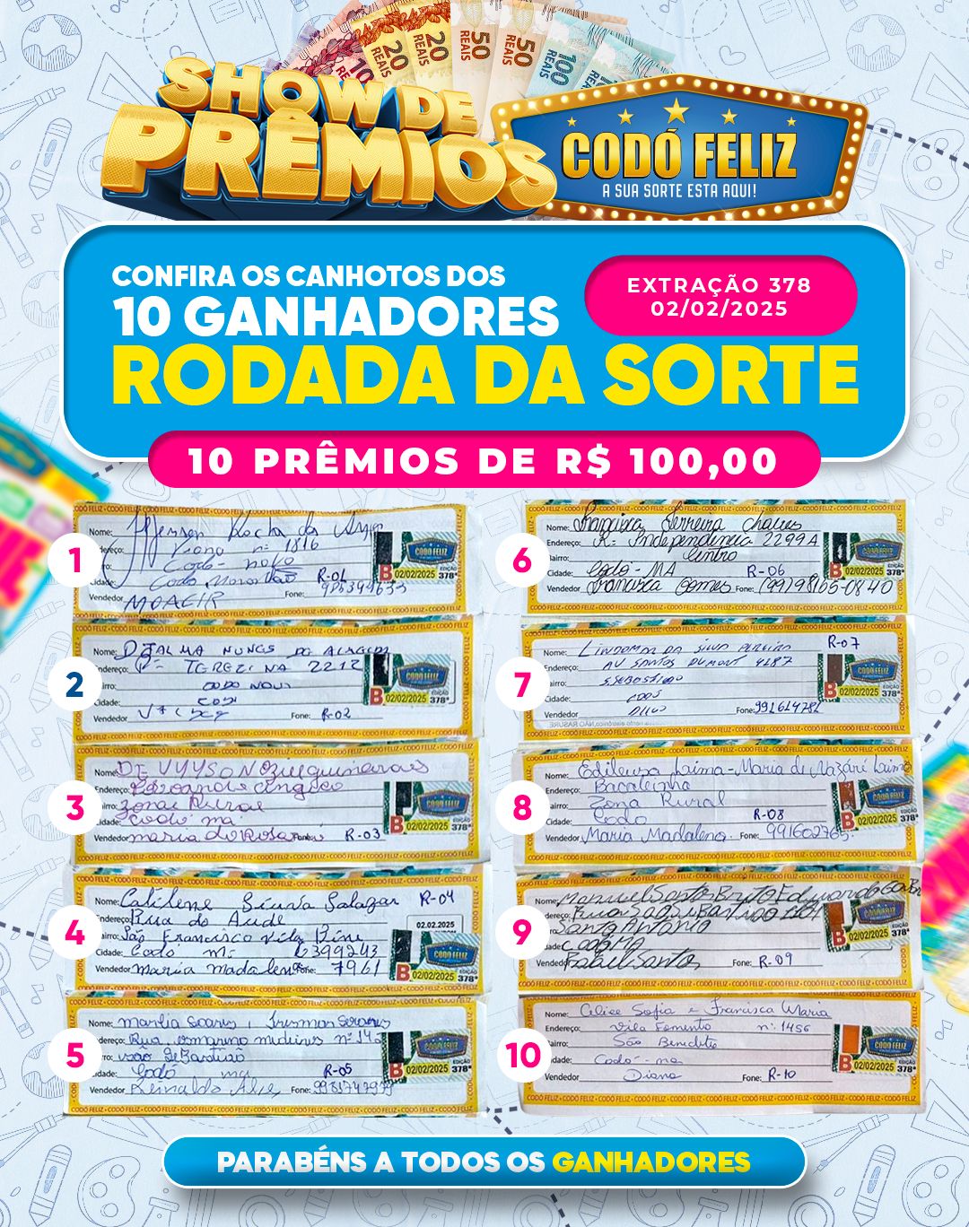 Confira os canhotos dos Ganhadores da 378ª Extração do Codó Feliz Publicado em: 3 de fevereiro de 2025Autor: Alberto BarrosDeixe um Comentário!