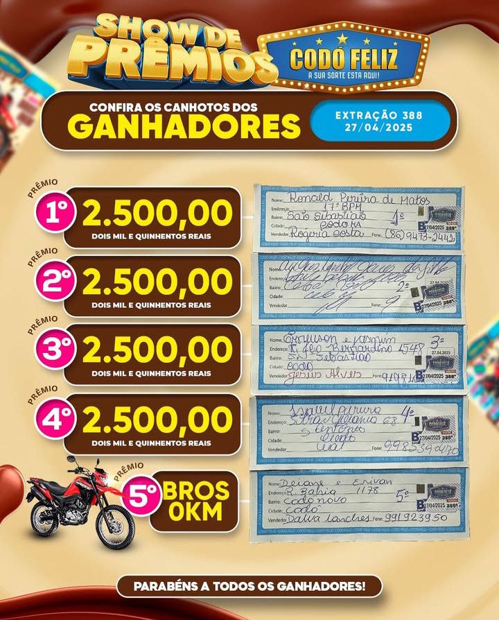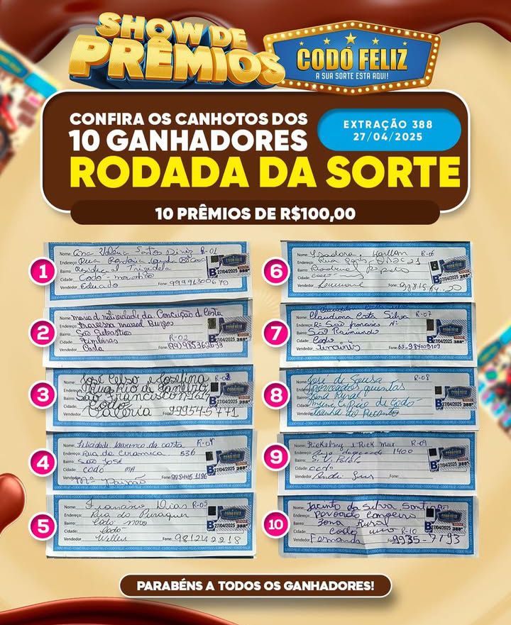 Confira os canhotos dos Ganhadores da 388ª Extração do Codó Feliz Publicado em: 28 de abril de 2025Autor: Alberto BarrosDeixe um Comentário!