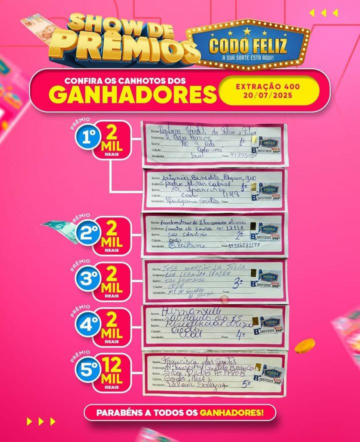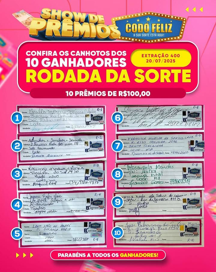 Confira os canhotos dos Ganhadores da 400° Extração do Codó Feliz Publicado em: 21 de julho de 2025Autor: Alberto BarrosDeixe um Comentário!